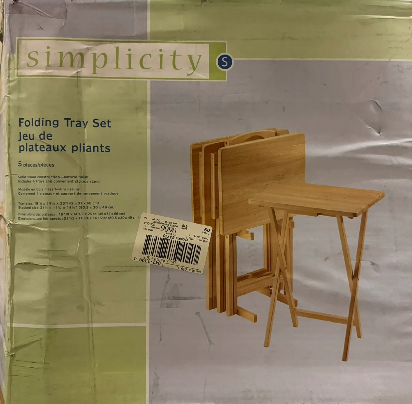 This is a 5-piece set of folding wooden trays with a natural finish. It includes 4 trays and a convenient storage stand. Each tray's dimensions are 19 1/8 x 14 1/2 x 26 in (49 x 37 x 66 cm). They're useful for extra surface space when you need it.