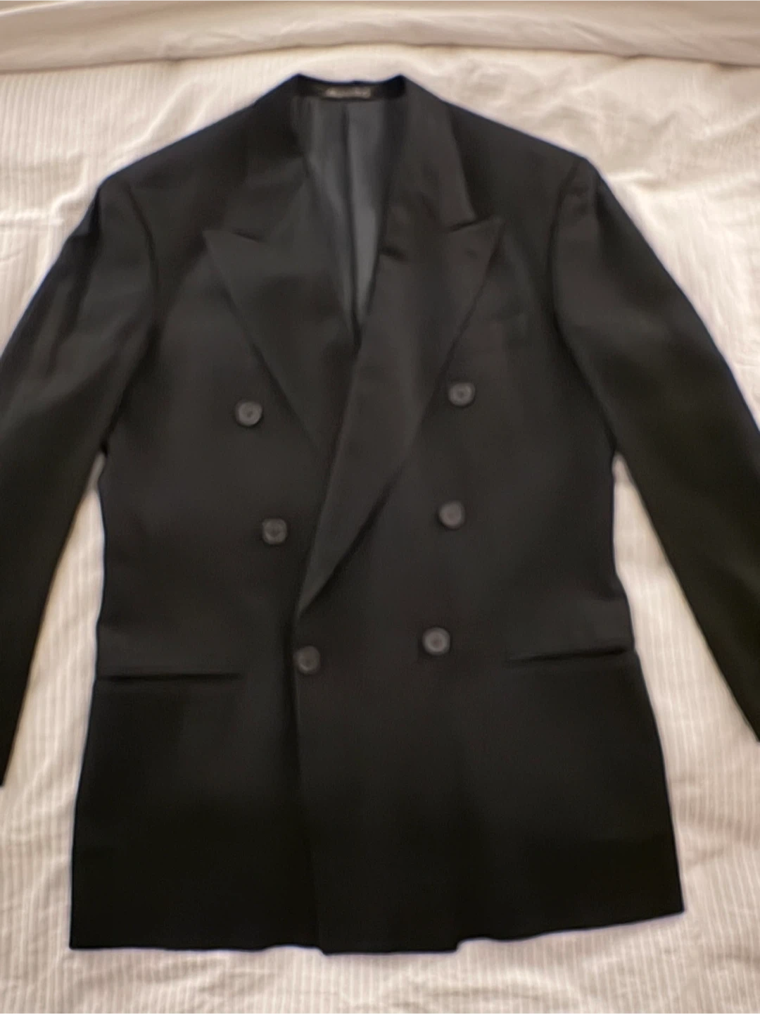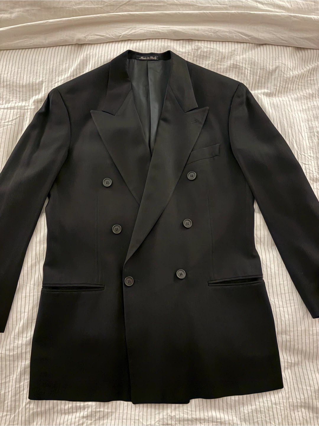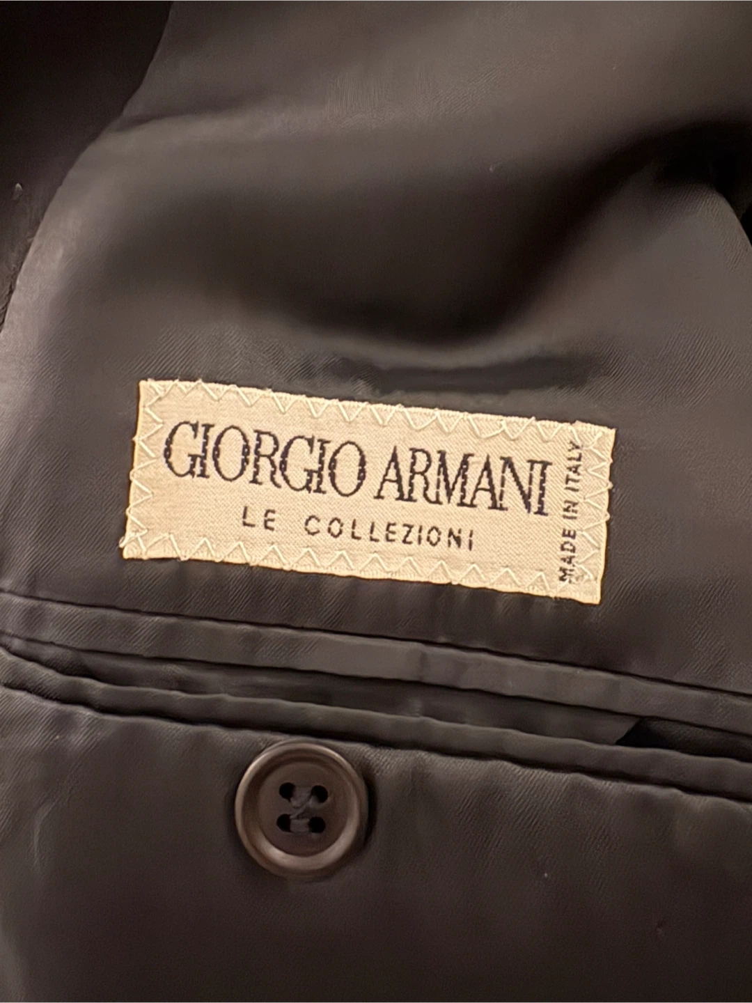 Classic black double-breasted blazer from Giorgio Armani's Le Collezioni line. Expertly crafted in Italy, this timeless piece features a sleek design and premium material. It's perfect for formal occasions or adding a touch of sophistication to any outfit!