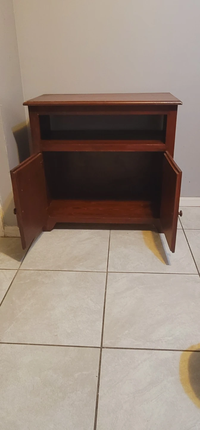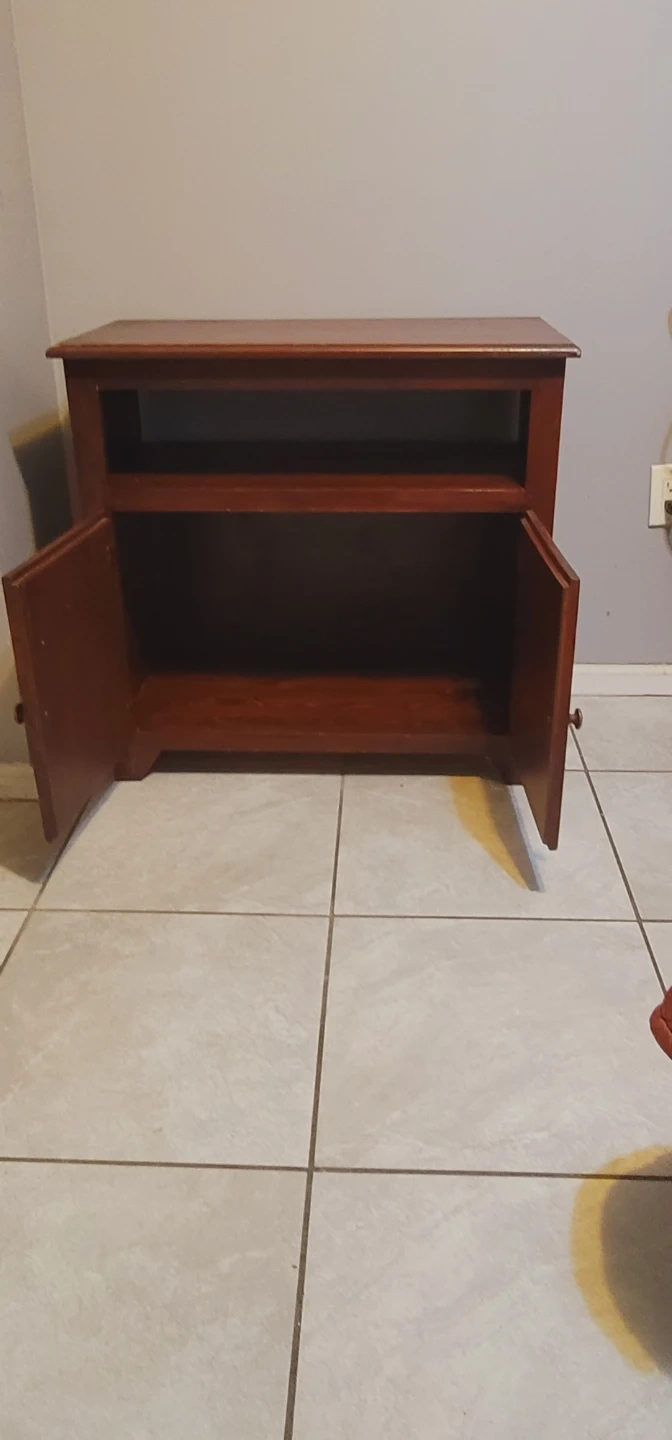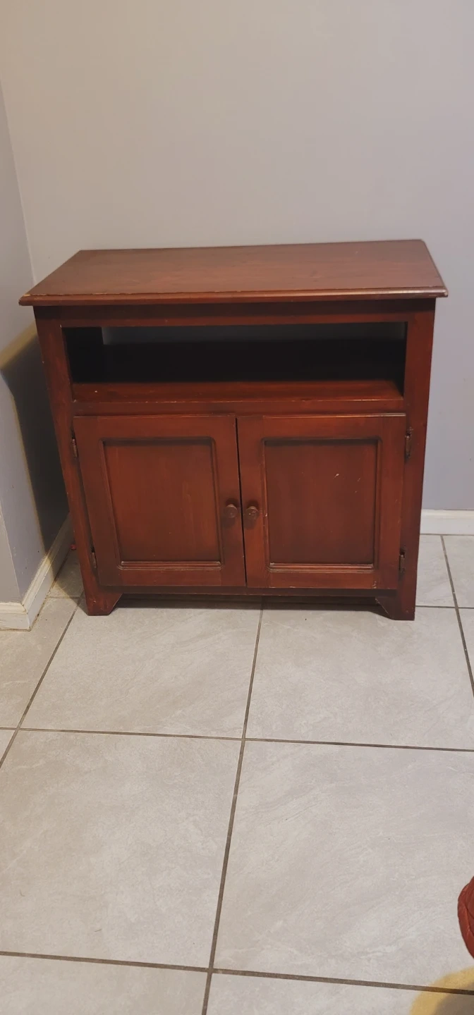 This is a wooden cabinet with a top shelf and two cabinet doors below. It's a versatile piece for storage or media. The wood has a reddish-brown finish. This cabinet would be useful for organizing small electronics or general household items.