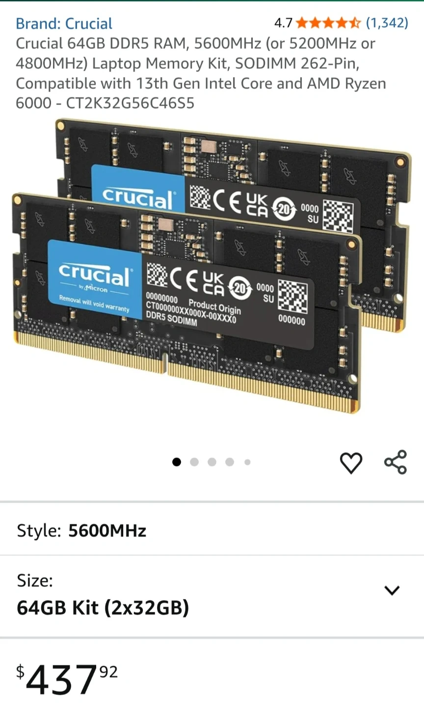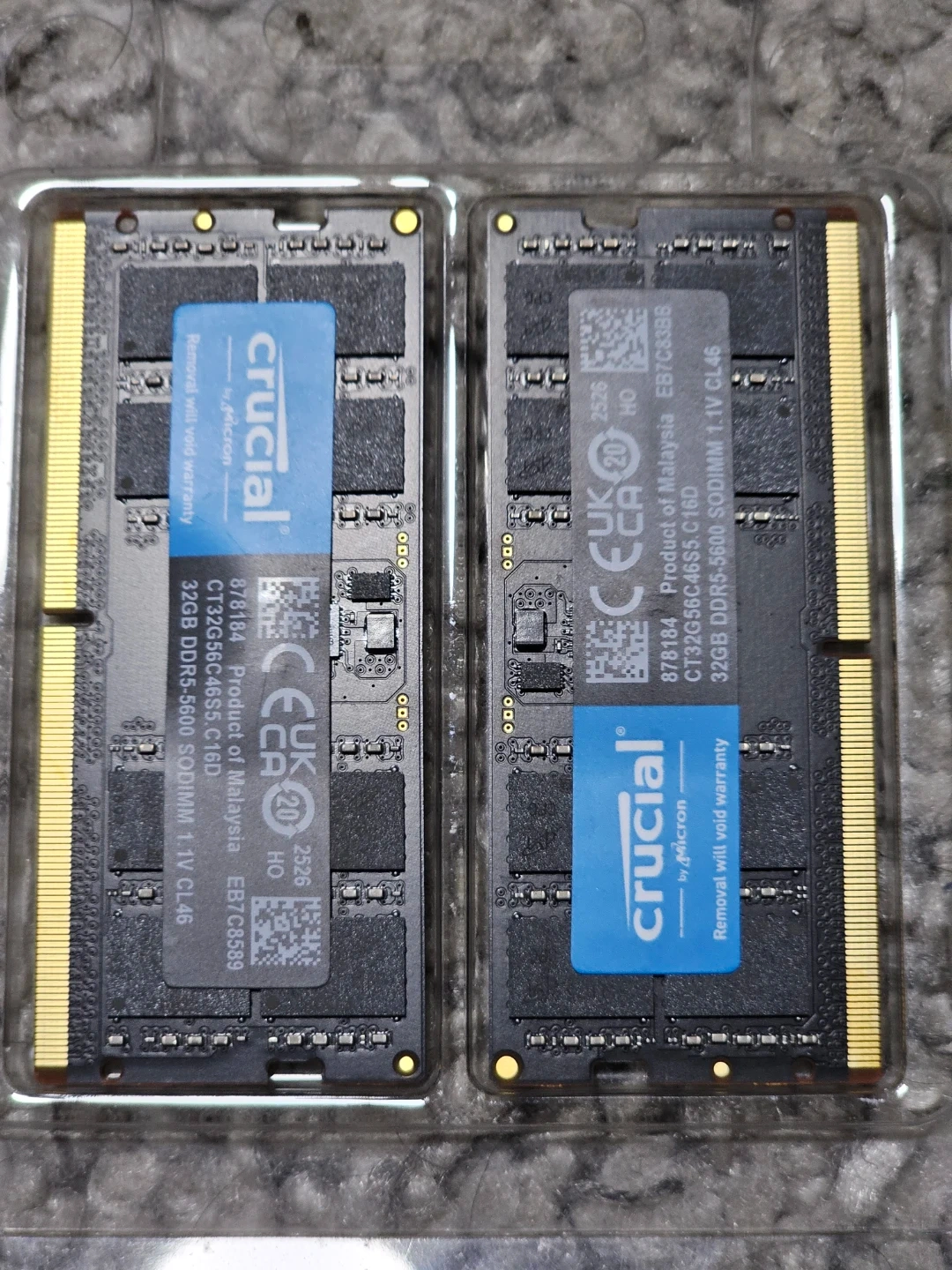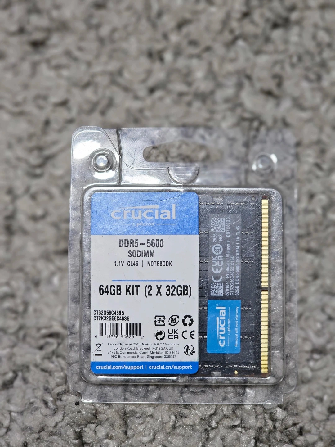 118Selling a Crucial DDR5-5600 SODIMM 64GB Kit (2 x 32GB) for laptops! This is a 1.1V CL46 notebook memory kit. It's compatible with 13th Gen Intel Core and AMD Ryzen 6000 series. Get a performance boost for your laptop!
