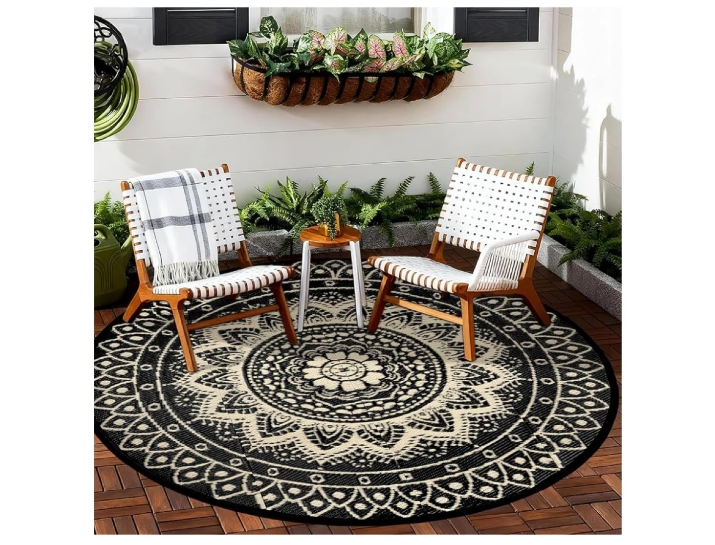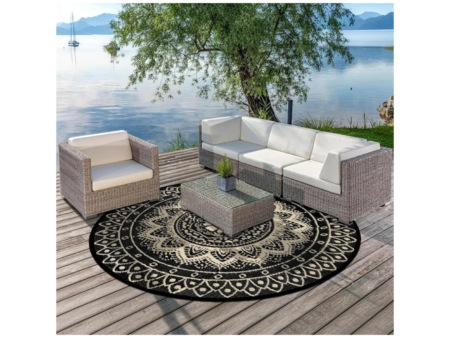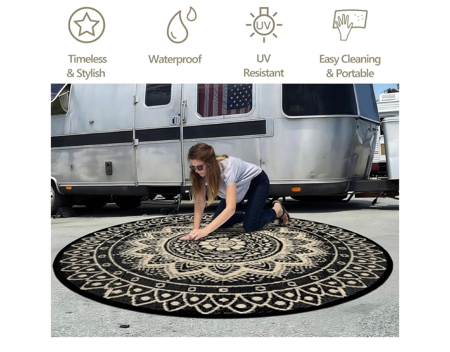 This waterproof and UV resistant round rug is perfect for your patio or deck. It's stylish with a black and beige mandala design. Comes with a carry bag for easy portability! Great for outdoor gatherings.