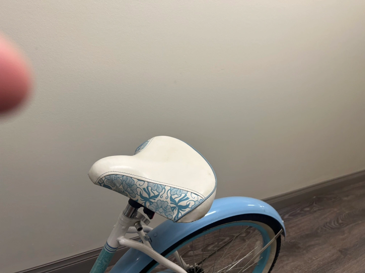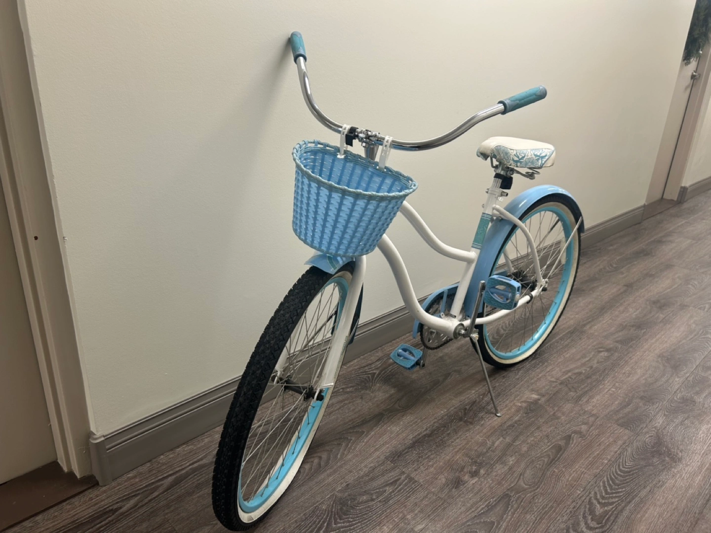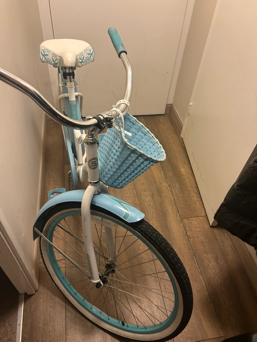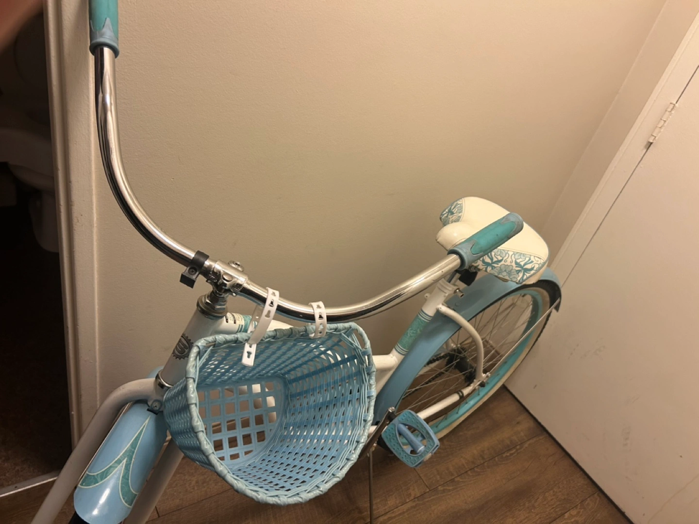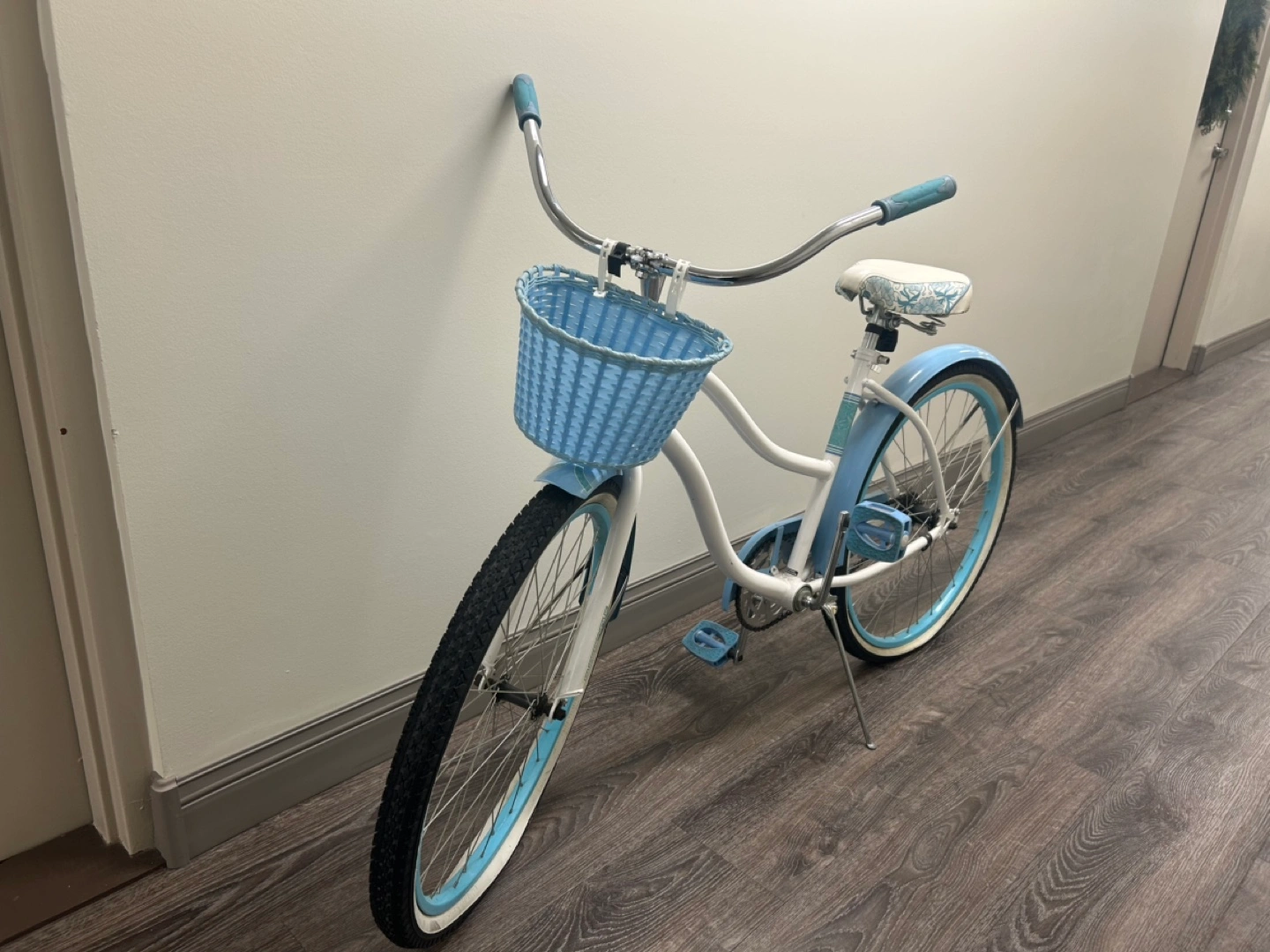 cruiser bicycle. Light blue and white. Features a wicker basket and patterned seat. Excellent condition.