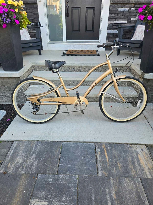 This stylish gold Cruiser Bike is perfect for leisurely rides around the neighbourhood. It's in good condition, ready for someone to hop on and enjoy the sunshine. Being a used bike, it has some minor wear and tear, but it's mechanically sound and a joy to ride. Here are some of its features: * Comfortable seat * Easy-to-use brakes * Stylish design * 7 speed Shimano gears * Almost never ridden If the ad is up, the bike is available.