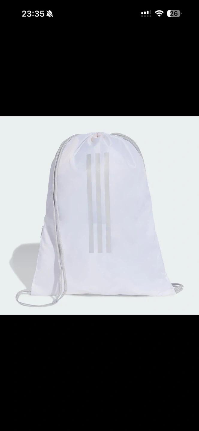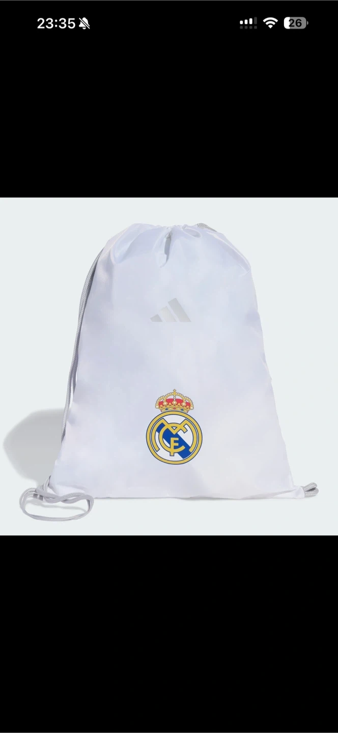 White Adidas drawstring bag with the Real Madrid crest. Features the classic Adidas three stripes on the back. Lightweight and easy to carry your essentials.
