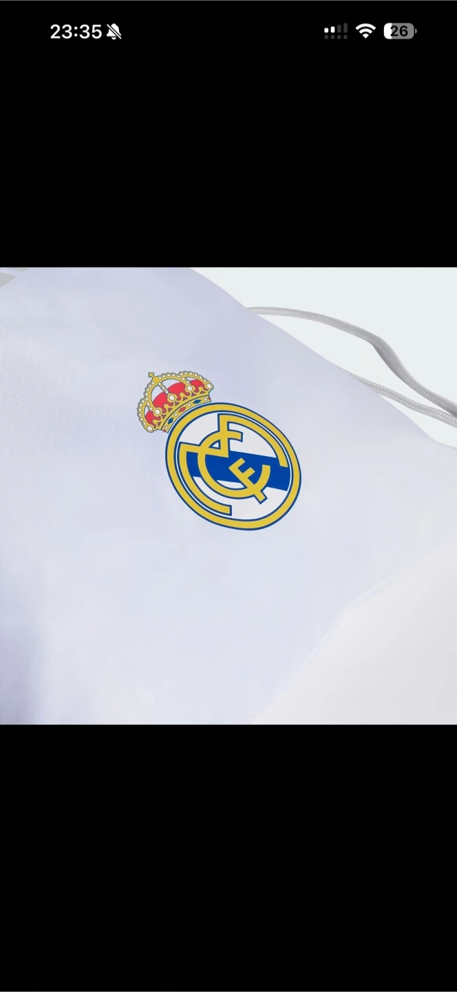 White Adidas drawstring bag with the Real Madrid crest. Features the classic Adidas three stripes on the back. Lightweight and easy to carry your essentials.
