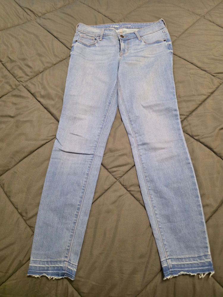 I'm selling a pair of Old Navy Rockstar mid-rise jeans in size 4 regular. They are in good condition and made of 65% cotton, 33% polyester, and 2% spandex/elastane. These jeans are light wash and have a raw hem. They are machine washable in cold water and can be tumble dried on low heat