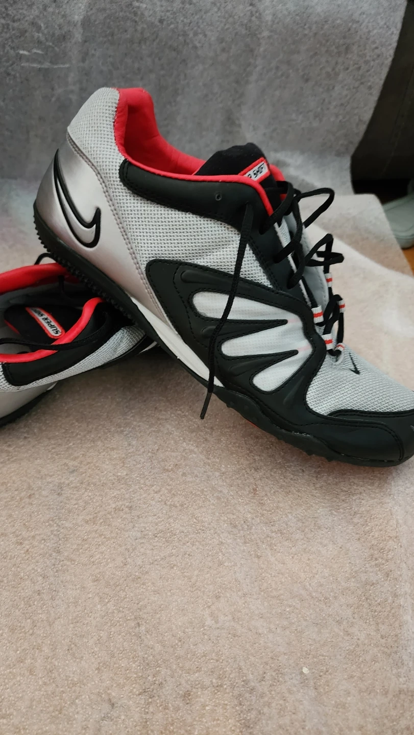 Bottes de sport Nike grises, noires et rouges. Pointure 11 US, 10 UK, 45 EUR, 29 CM. Fabriquées en Chine. Semelle intérieure confortable.