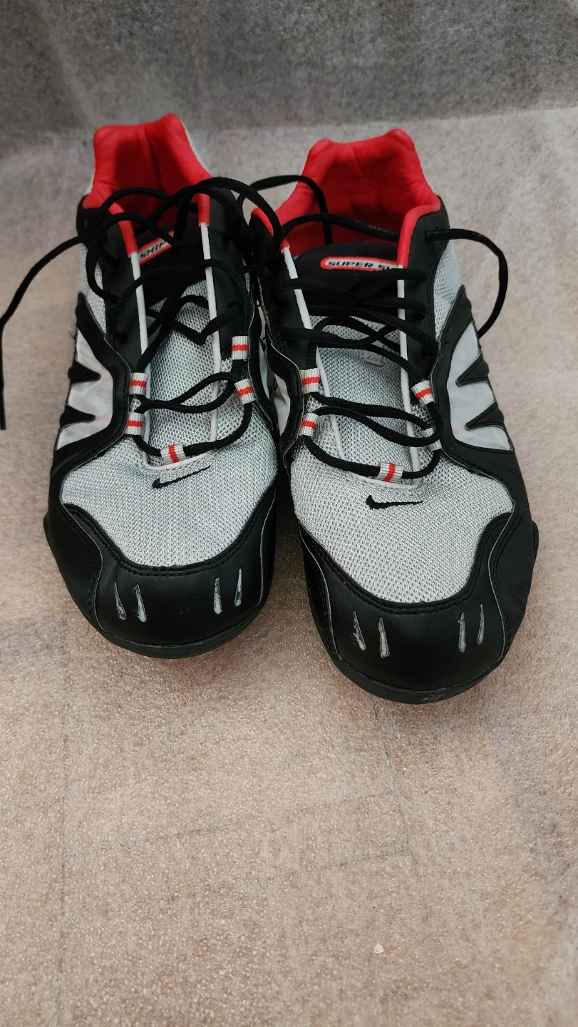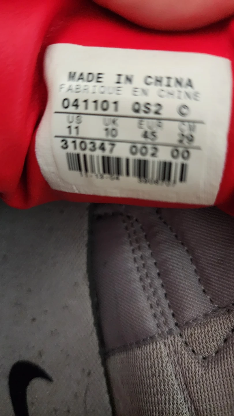 Bottes de sport Nike grises, noires et rouges. Pointure 11 US, 10 UK, 45 EUR, 29 CM. Fabriquées en Chine. Semelle intérieure confortable.