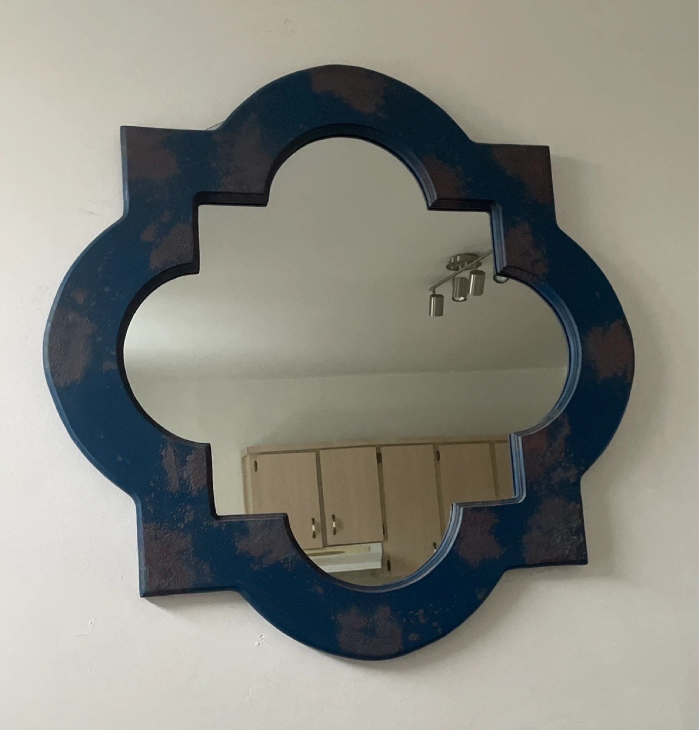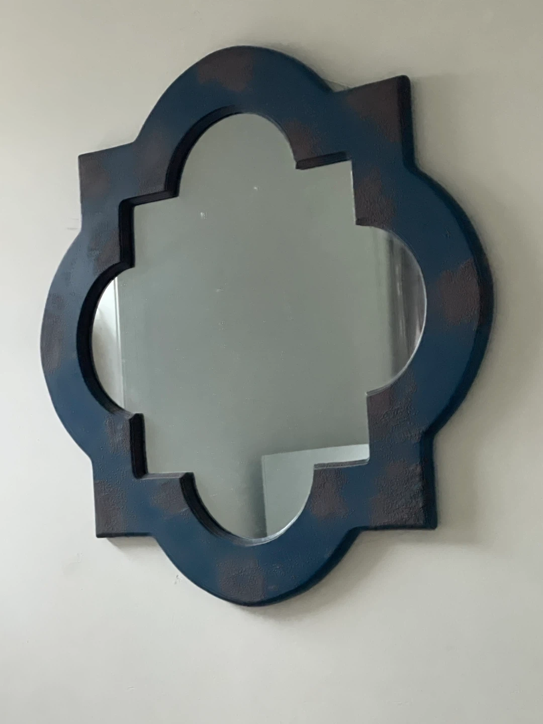 Unique blue quatrefoil-shaped mirror with a distressed finish. Adds a stylish touch to any room. Measures approximately 18 inches tall by 18 inches wide.
