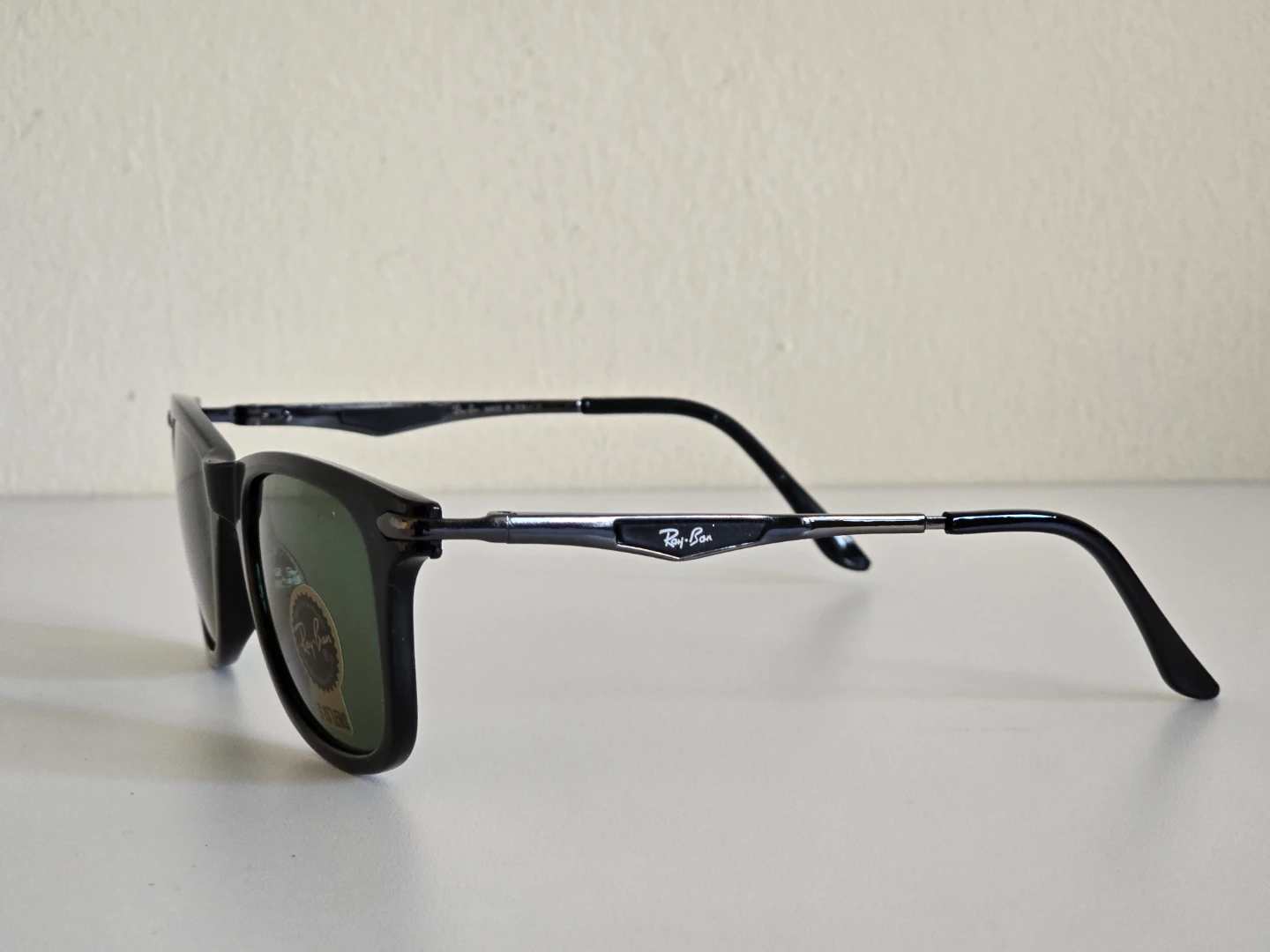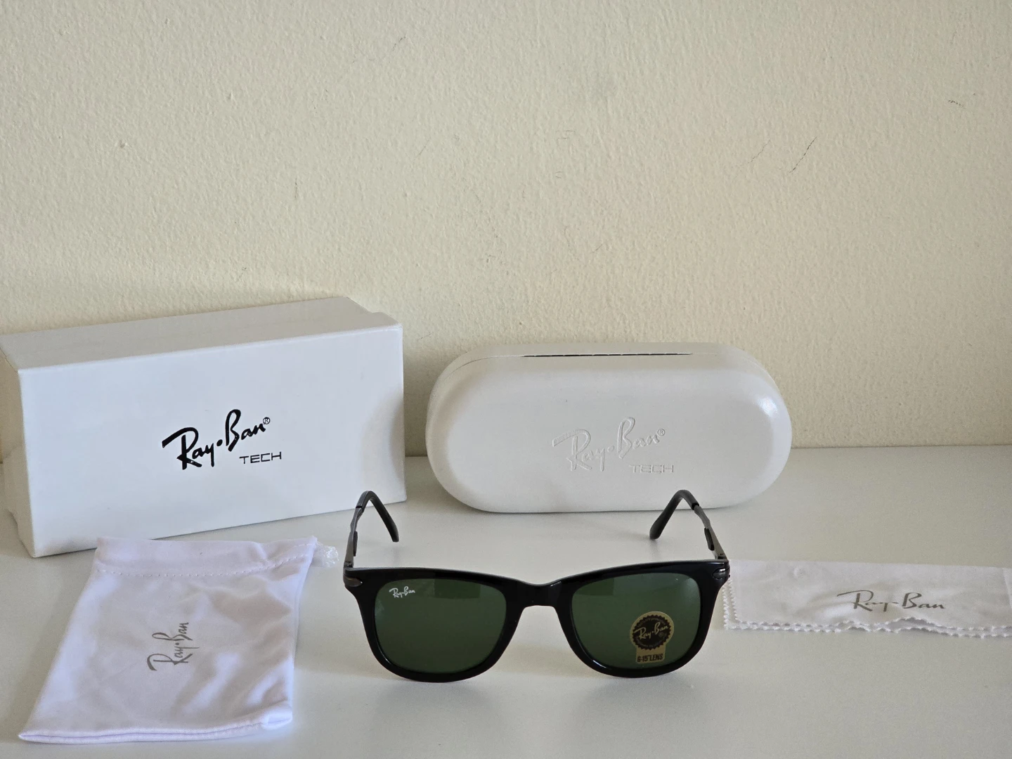 These are Ray-Ban Tech sunglasses with green lenses. They come with the original box, a hard case, and a cleaning cloth. A great pair of shades for everyday use!