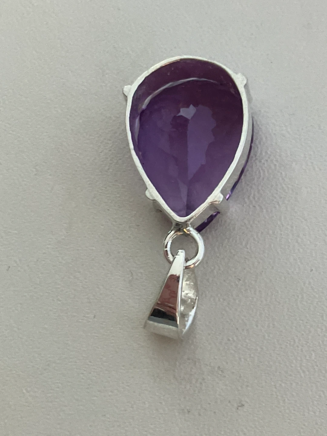 This is a lovely amethyst gemstone pendant, perfect for adding a touch of colour to any outfit. It's in great condition and ready to wear!