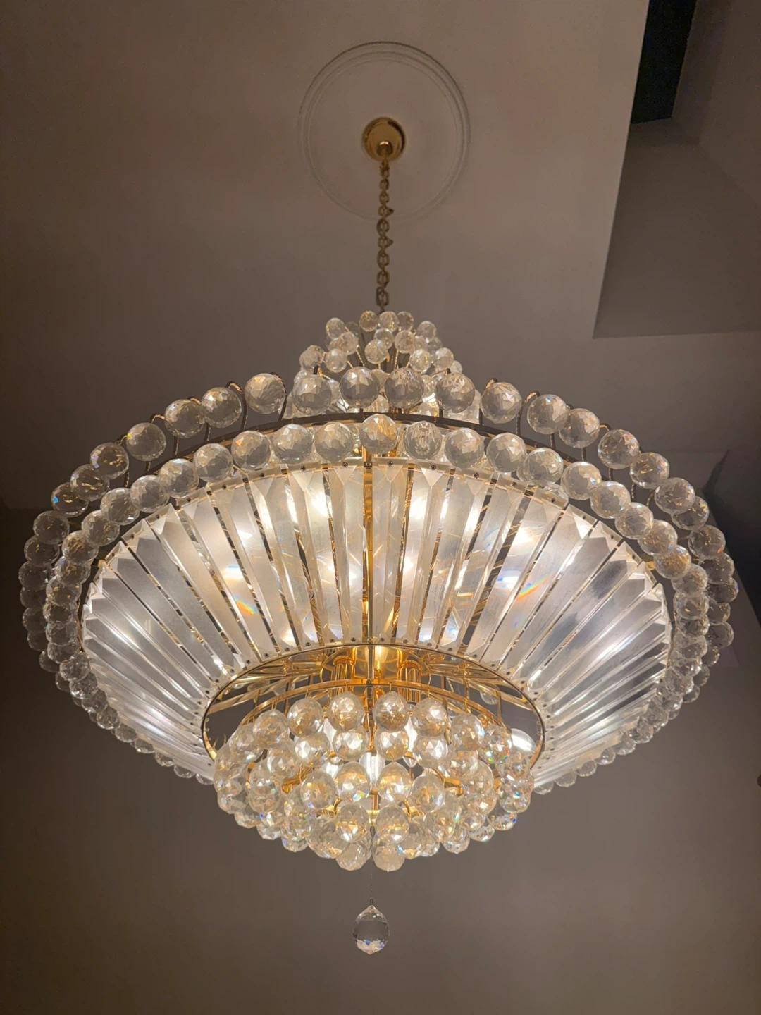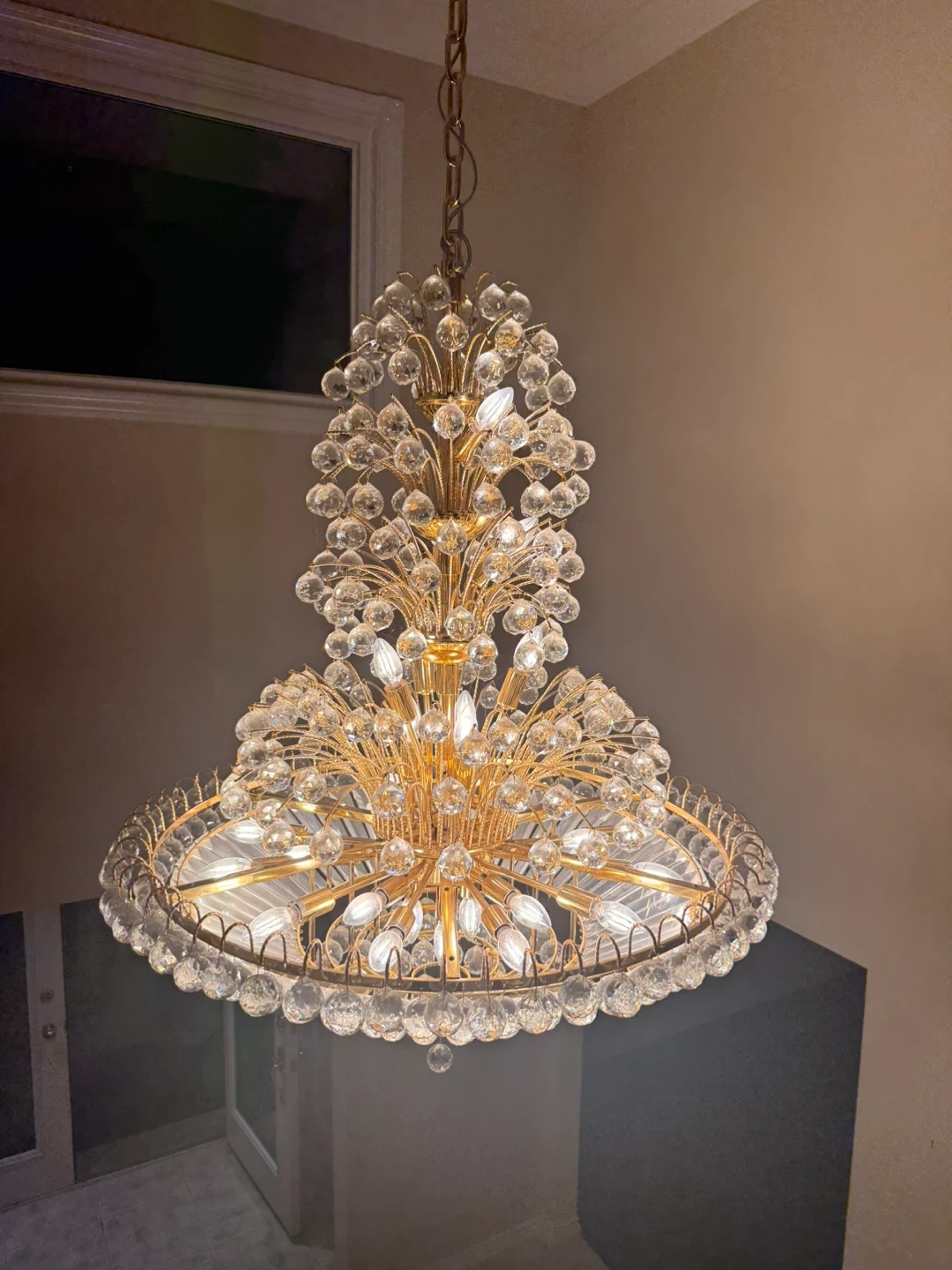 Beautiful crystal chandelier that adds a touch of elegance to any room! It features a gold-tone frame and sparkling crystals that catch the light beautifully. Perfect for a dining room, living room, or entryway 41“ wide 46“ high 28 Bulbs E12 Pickup Bayview/Green Lane Needs to be de-installed!! Bring long ladder!