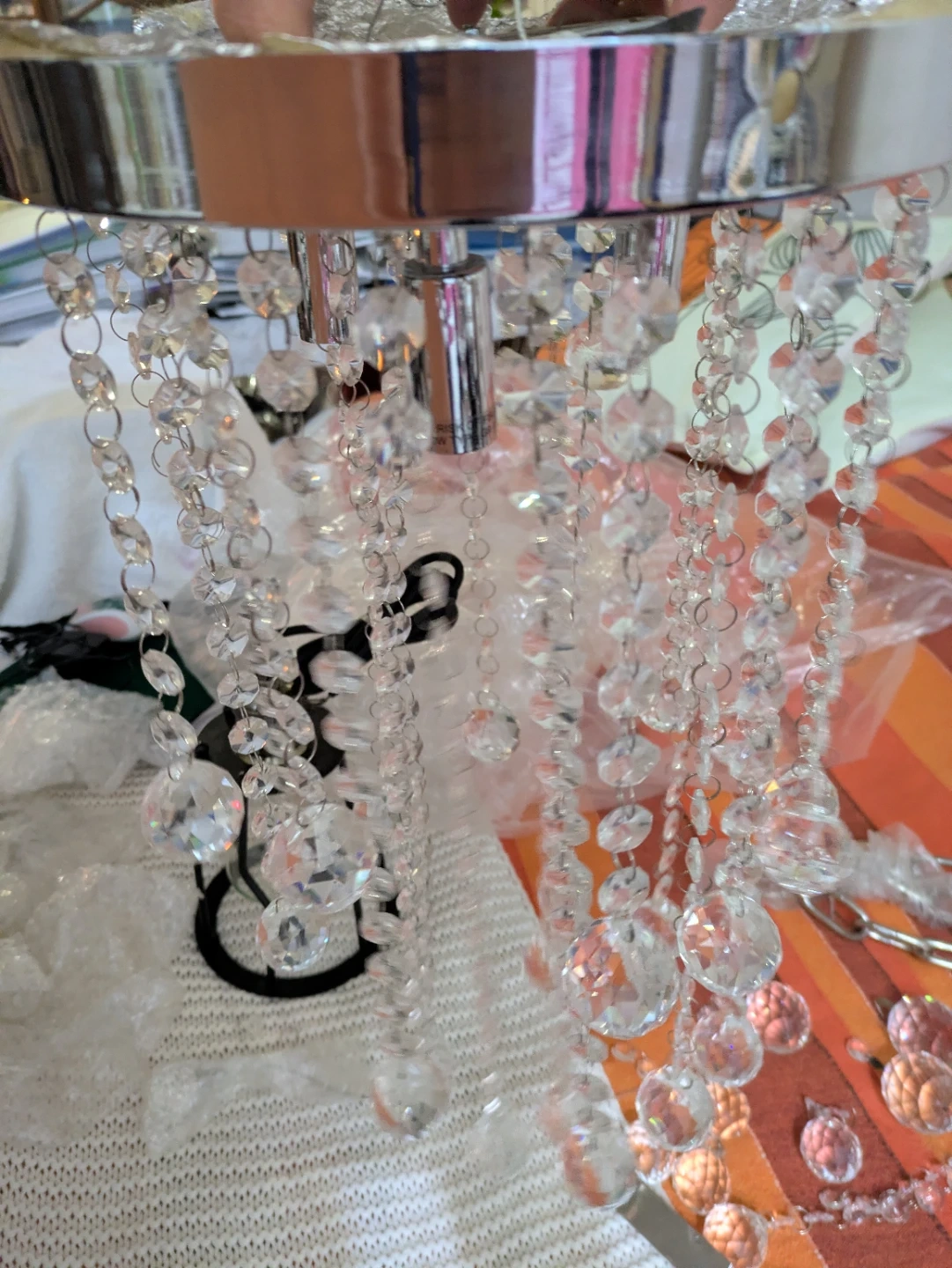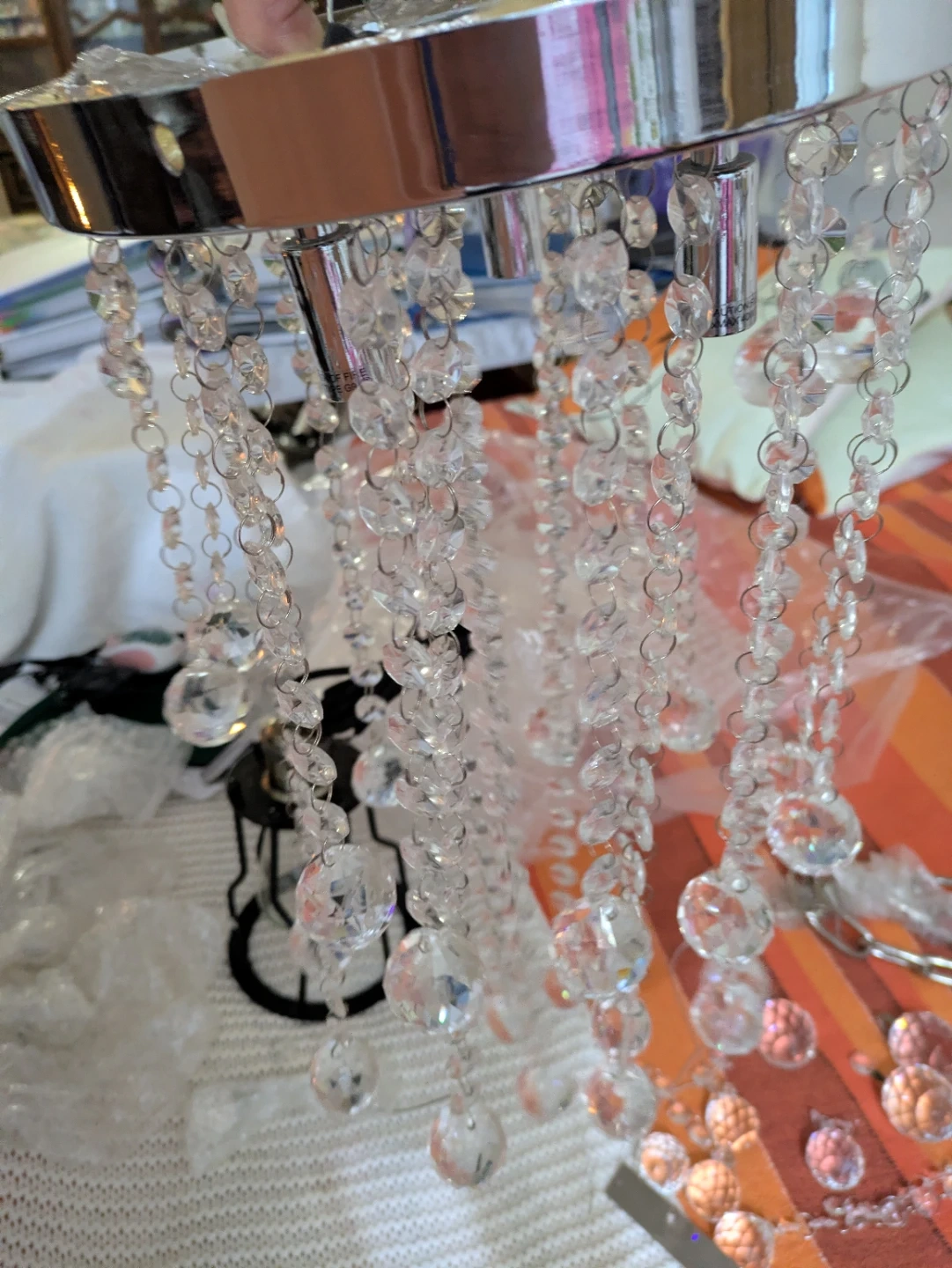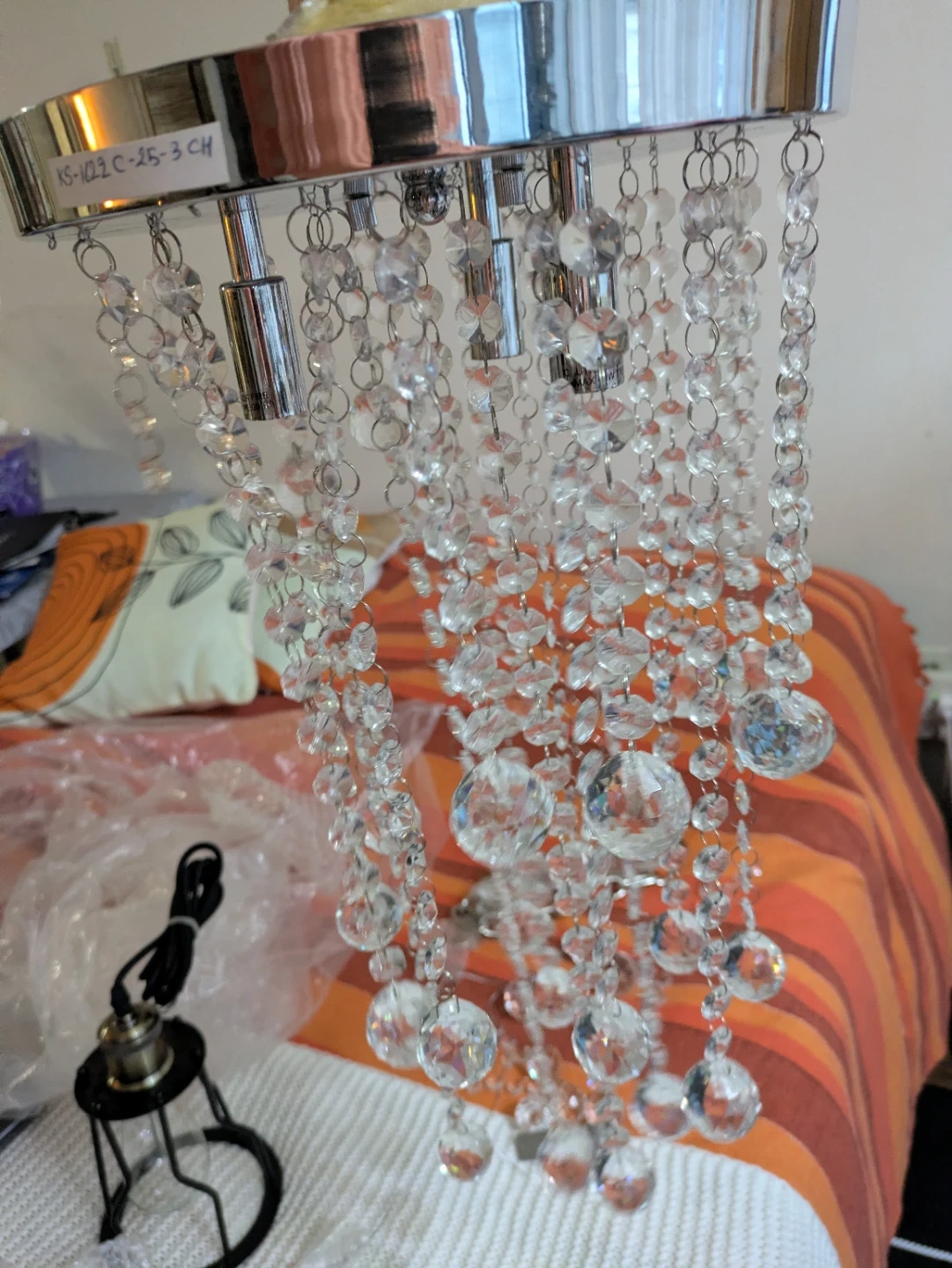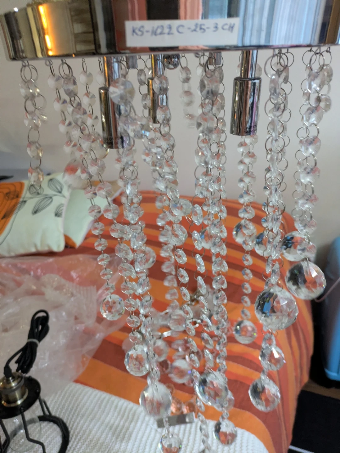 15Selling a beautiful crystal chandelier lighting fixture! It features cascading strands of clear crystals and a chrome finish. The model number appears to be KS-1022 C-25-3 CH. Perfect for adding a touch of elegance to any room...theres some spare crystal balls.. Location: warden and sheppard