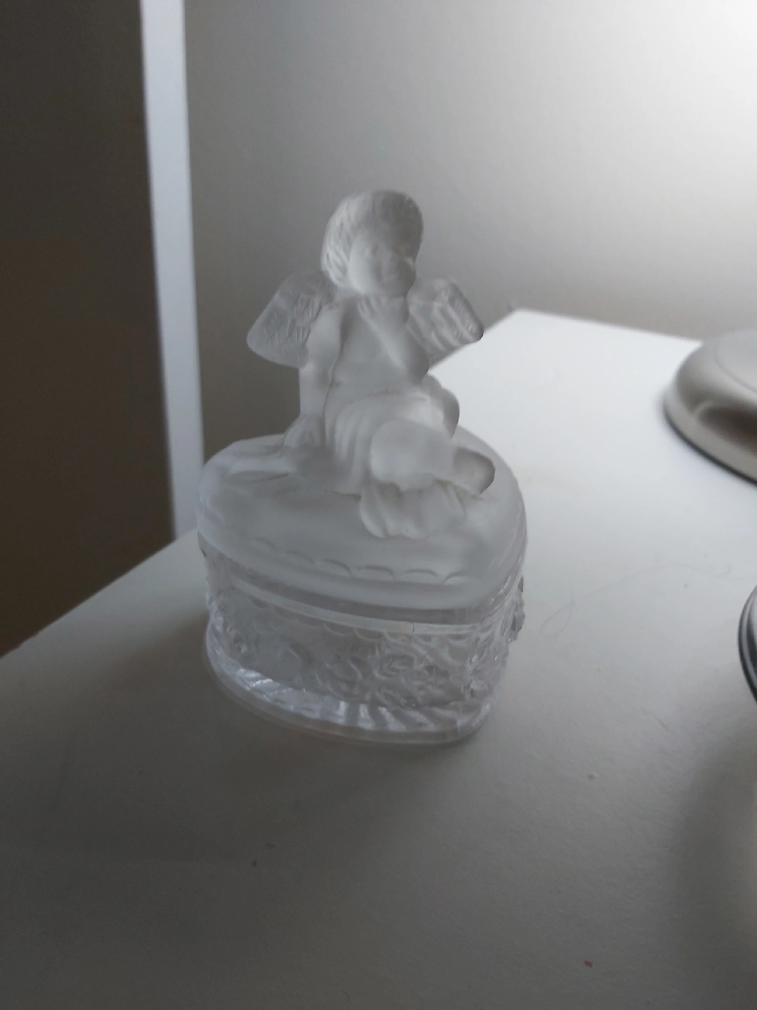 Selling a sweet little Crystal Clear trinket box featuring an angel on top. It's in great shape and perfect for storing small treasures or adding a touch of whimsy to your space or for a gift