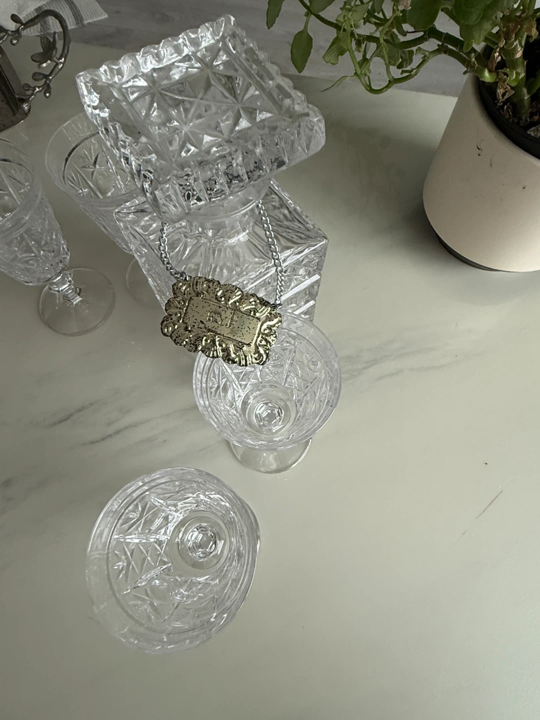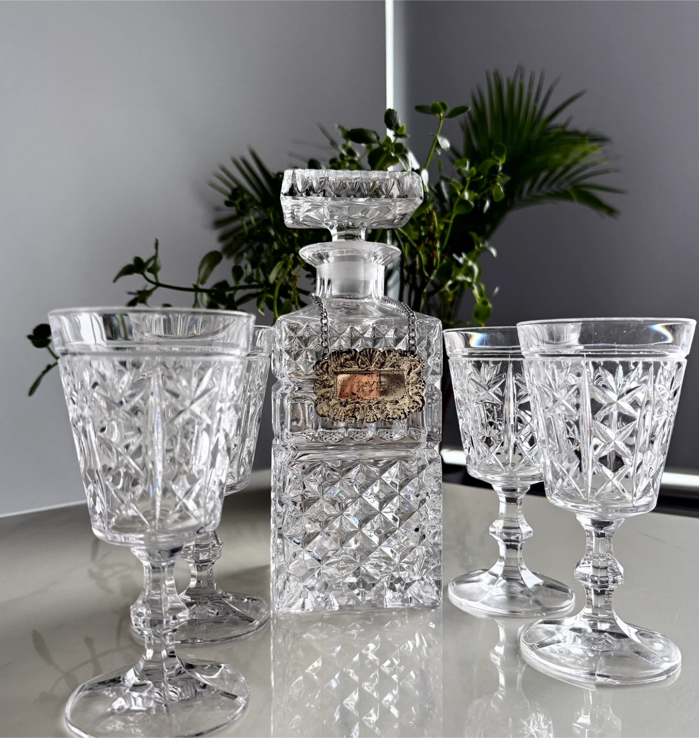 10Beautiful crystal decanter with matching glasses. Perfect for entertaining or adding a touch of elegance to your home bar. The set features intricate detailing and a classic design. A timeless addition to any collection!
