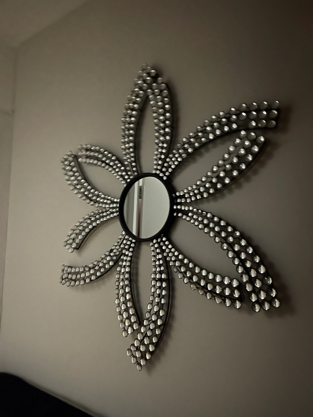 84Metal wall mirror with a crystal design. The mirror is in the shape of a flower.as is pick up only