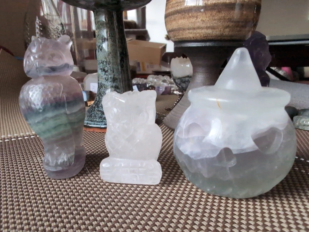 90Selling a couple of my cute high quality crystal figurines collection. There are 2 owl, 1 is quartz and the other rainbow. The pumpkin cauldron is rainbow fluorite. They would look great on a shelf or desk! Selling is a lot 40$ Cash only pick up only Crystal pendants, pendants, crystals, crystal collection, high quality crystals
