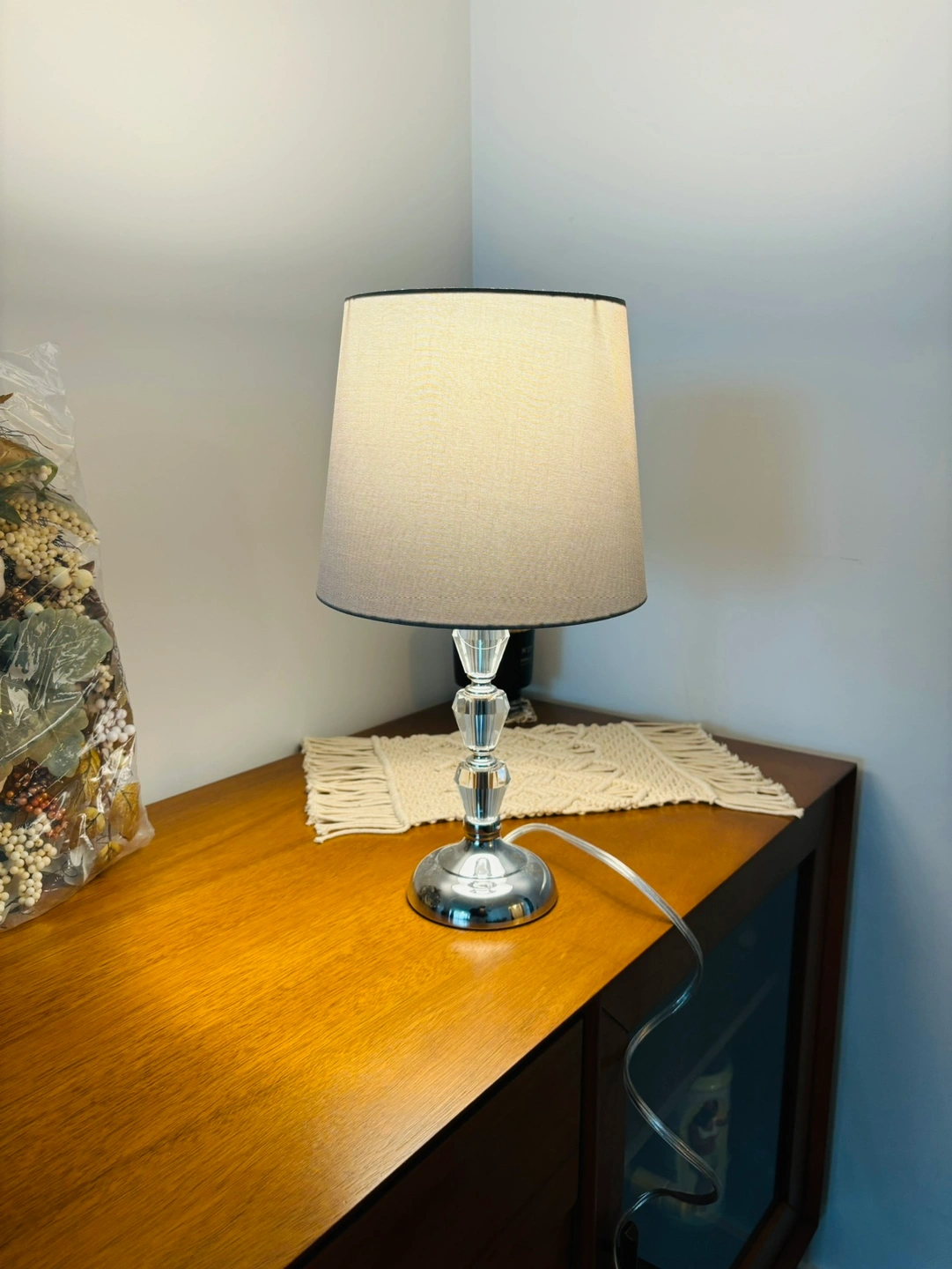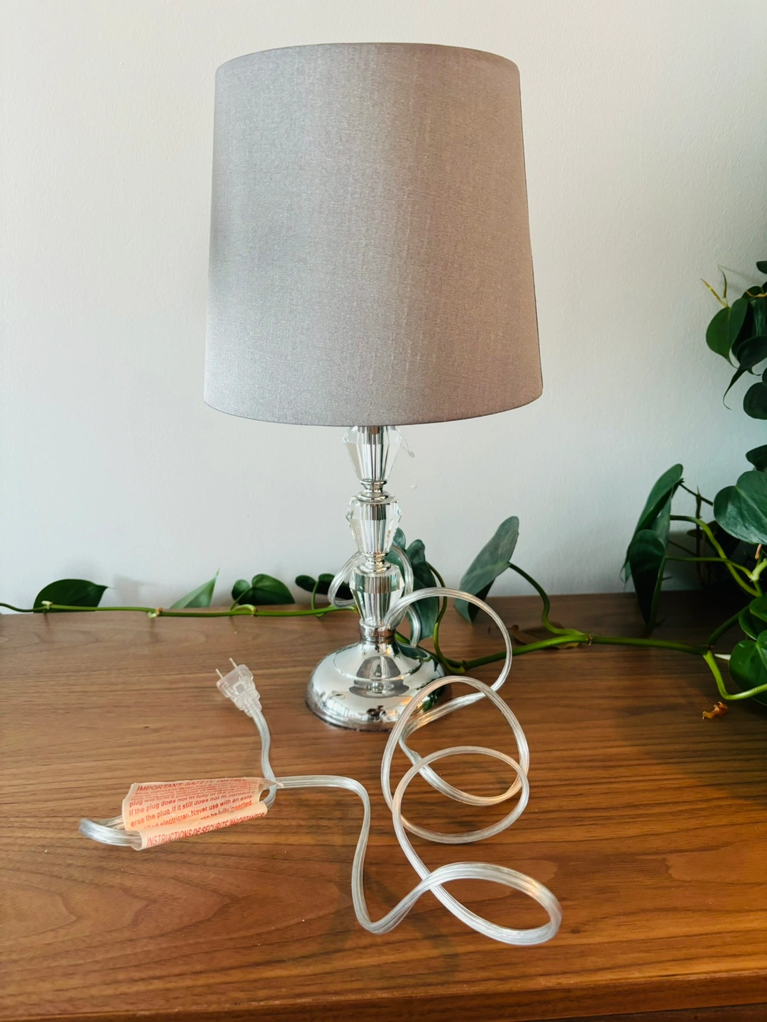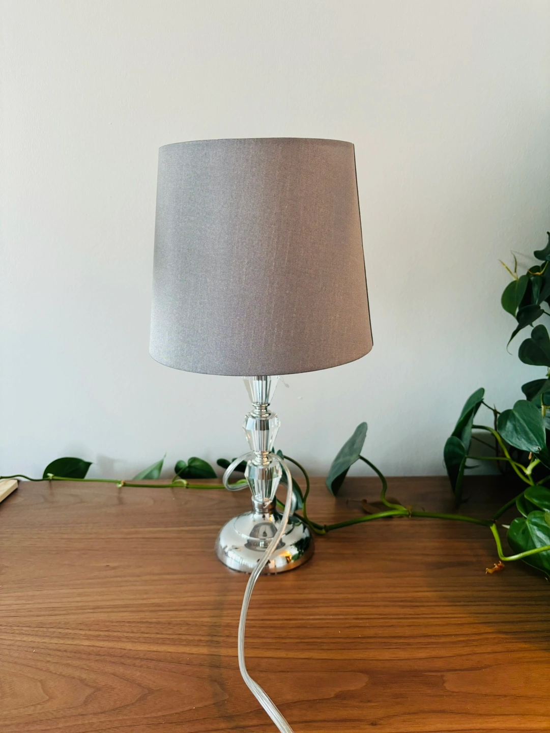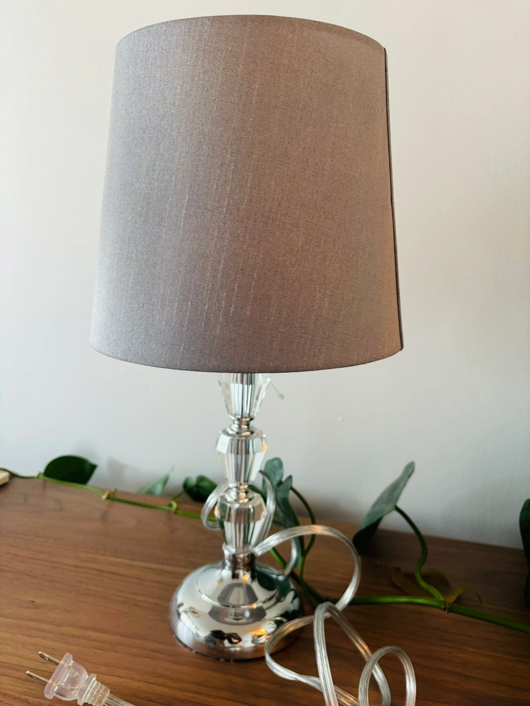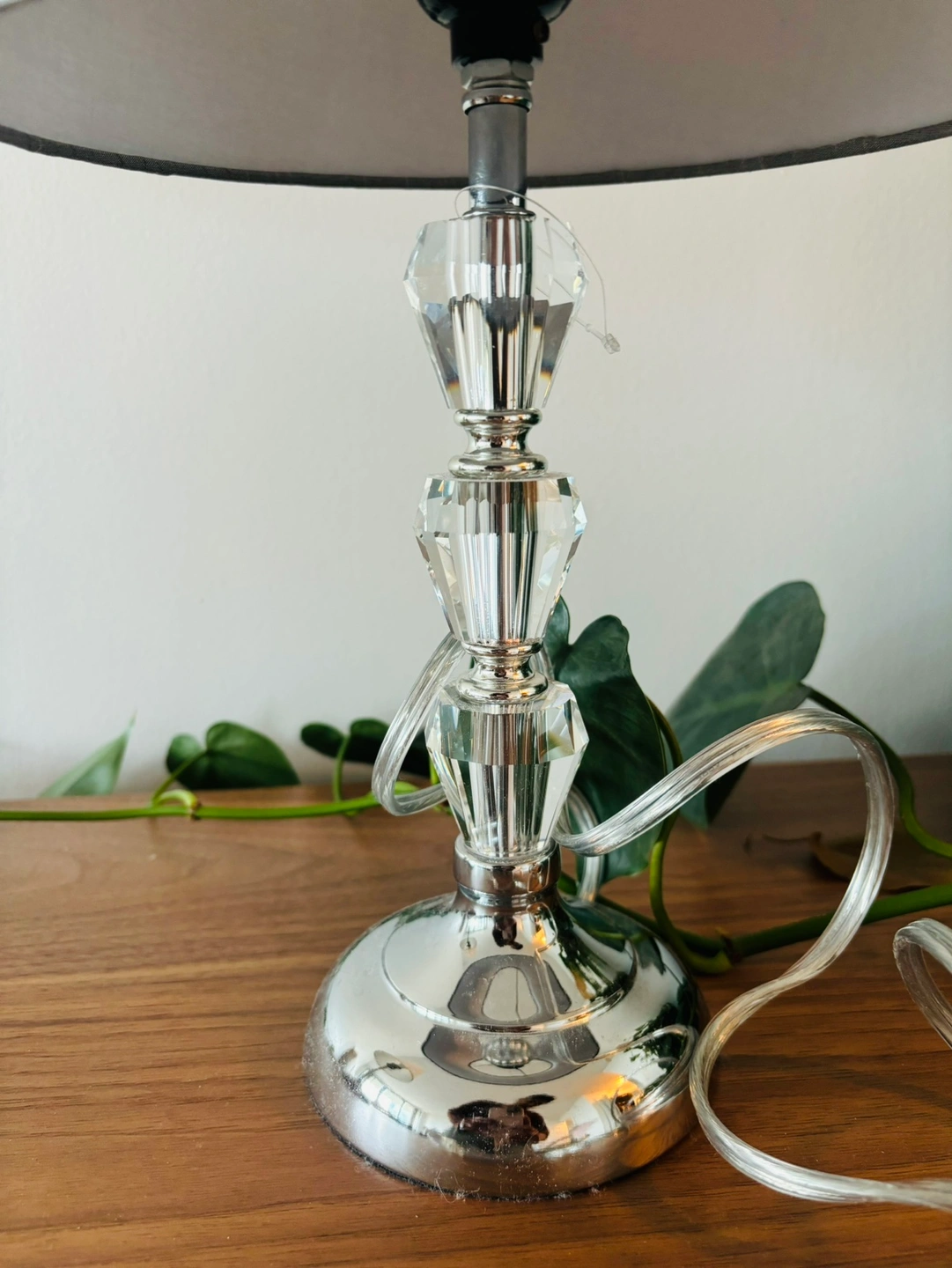 23A stylish and contemporary table lamp with a crystal base and a grey fabric lampshade. The lamp is in excellent condition. It is a great addition to any home. (Bulb not included)