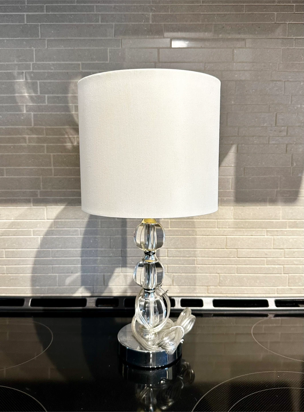 65Selling a lovely crystal table lamp! It has a classic design with a clear crystal base and a crisp white lampshade. It would be a great addition to any living room or bedroom. The lamp is in great condition and ready to brighten up your space