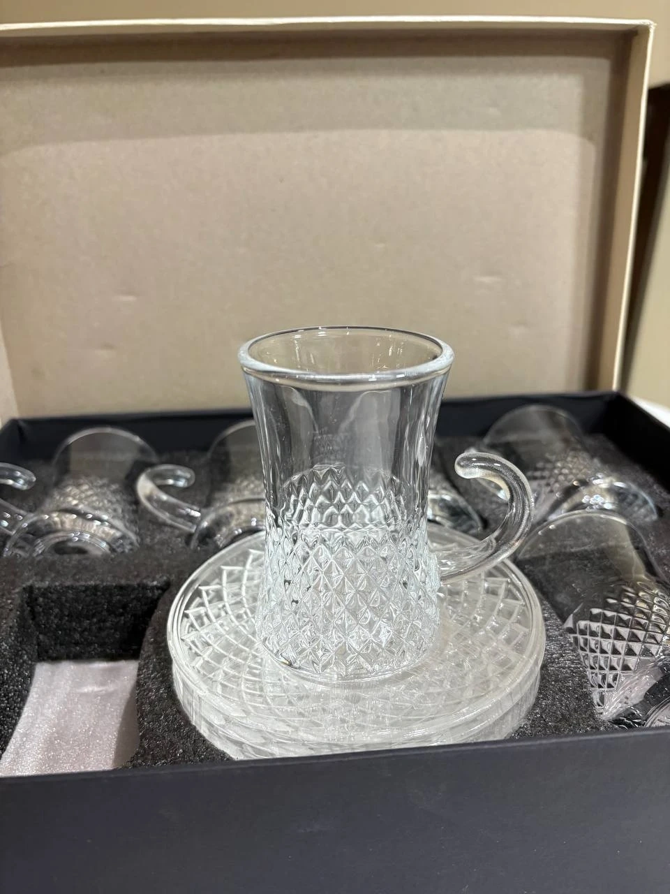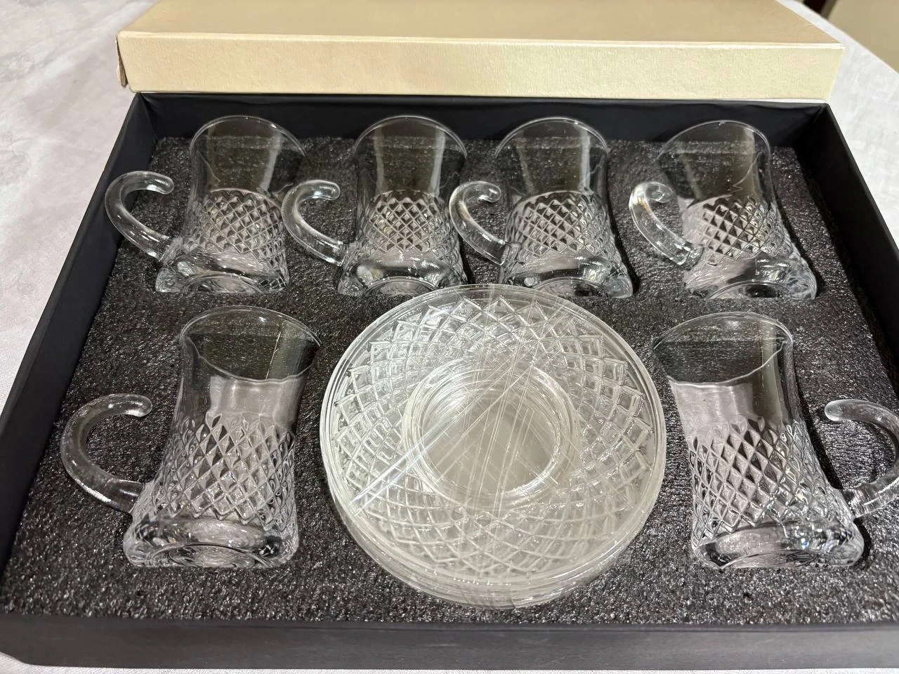 101Selling a beautiful set of crystal tea cups and saucers! The set includes six cups and six saucers, all in excellent condition. They come in their original box, making them perfect for gifting or adding a touch of elegance to your tea time