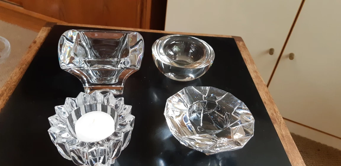 826A set of four beautiful crystal candle holders They're in great condition and would look lovely in any home! 1. Mikasa (Japan) 2. iittala (Finland) 3. Orrefors (Sweden) 4. Mikasa (Japan)