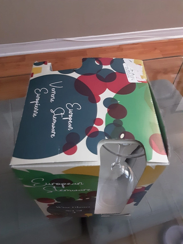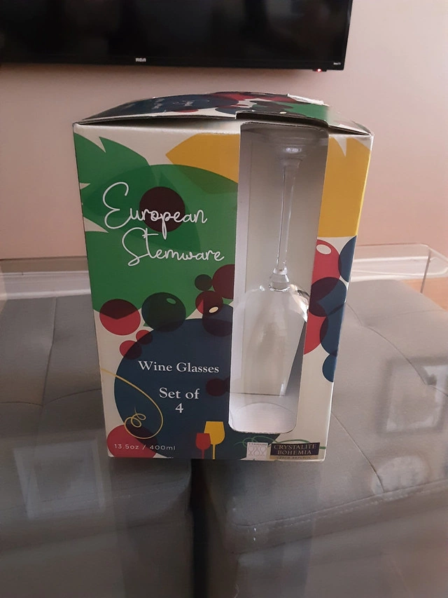 101I'm selling a brand new set of Crystalline Bohemia European Stemware wine glasses, which includes four glasses at 13.5 oz / 400 ml capacity each. These glasses are perfect for adding a touch of elegance to any dinner party or enjoying a relaxing glass of wine after a long day. They have never been used and are in pristine condition, still in their original packaging. * **Brand**: Crystalline Bohemia * **Type**: Wine Glasses * **Quantity**: Set of 4 * **Capacity**: 13.5 oz / 400 ml If you're seeing this ad, these glasses are still available, ready to bring some sparkle to your table!
