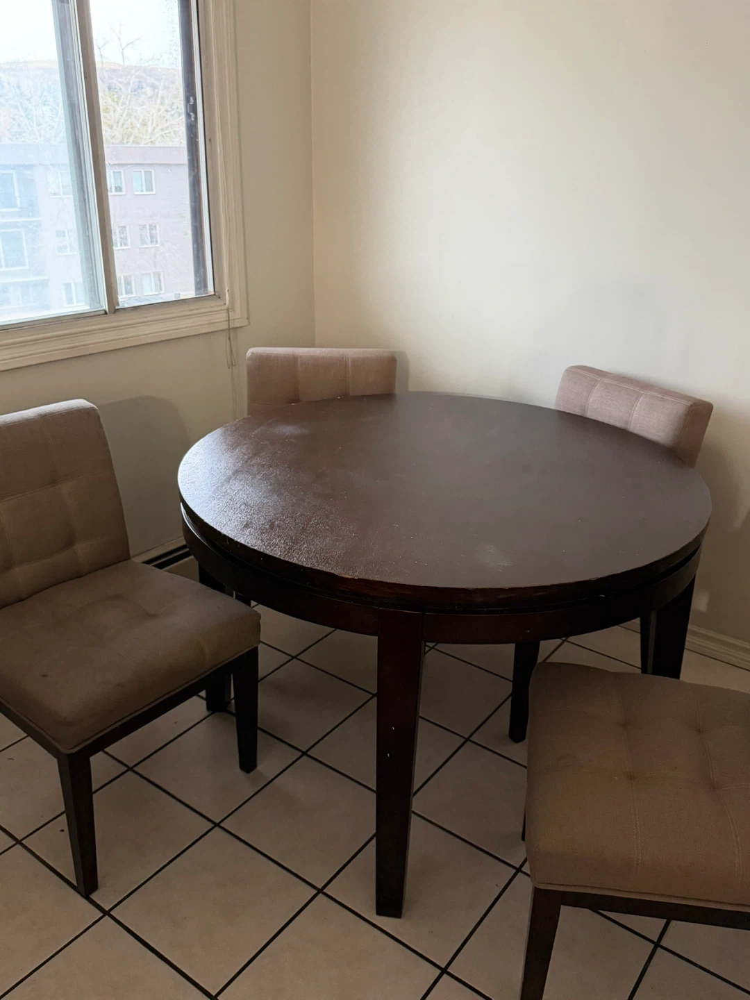 A round dark wood dining table with four upholstered chairs. This set is perfect for smaller dining spaces or breakfast nooks. It's a great option for quick meals or casual gatherings.