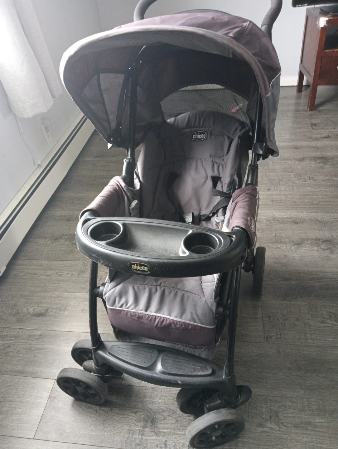 This is a Chicco stroller. It has a canopy and a tray with cup holders. The stroller has a grey and purple colour scheme.