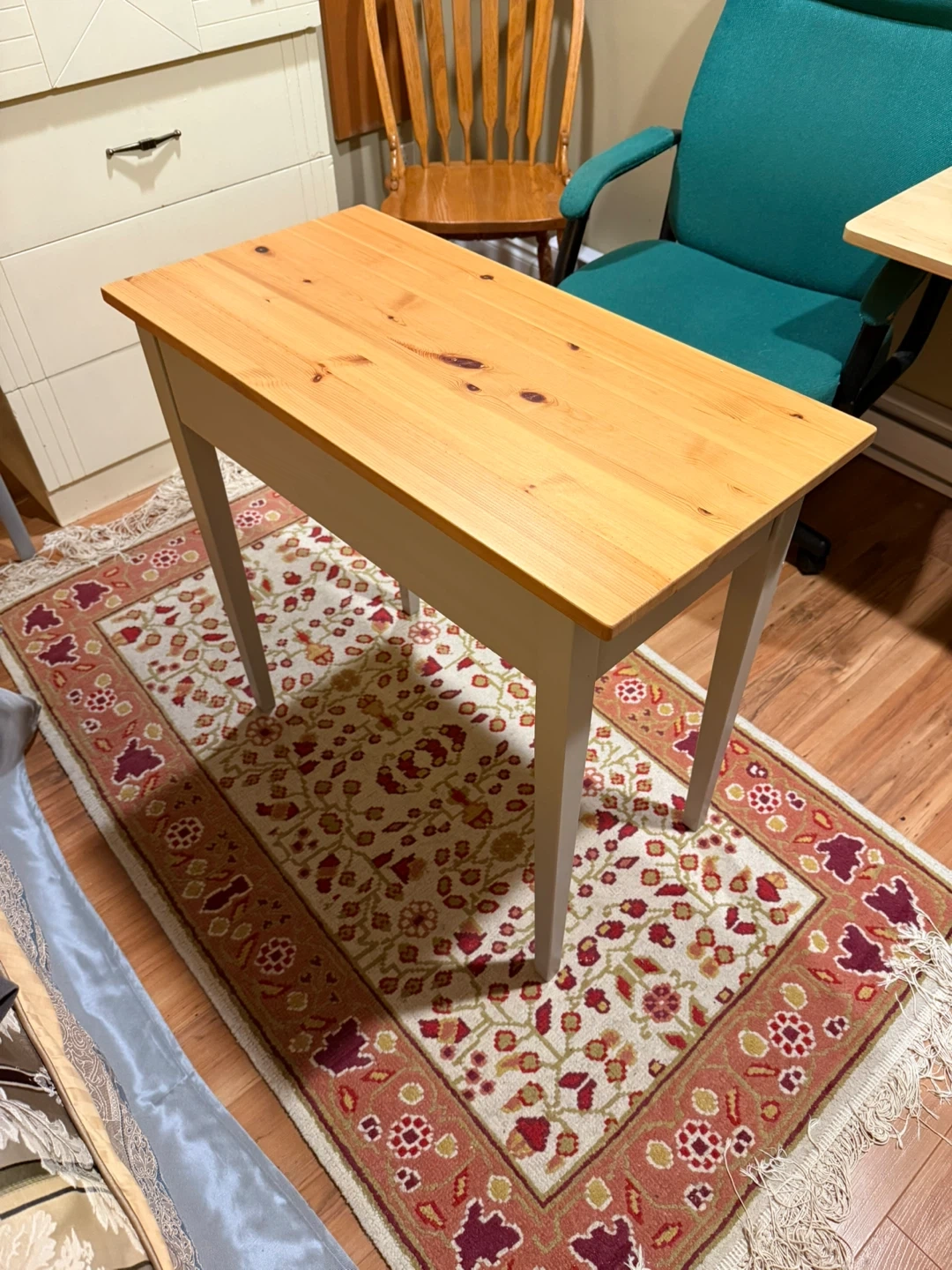 A simple ikea table with pine wood top and grey painted legs. It has a pull-out drawer for storage. This desk is suitable for a small workspace or as a side table.