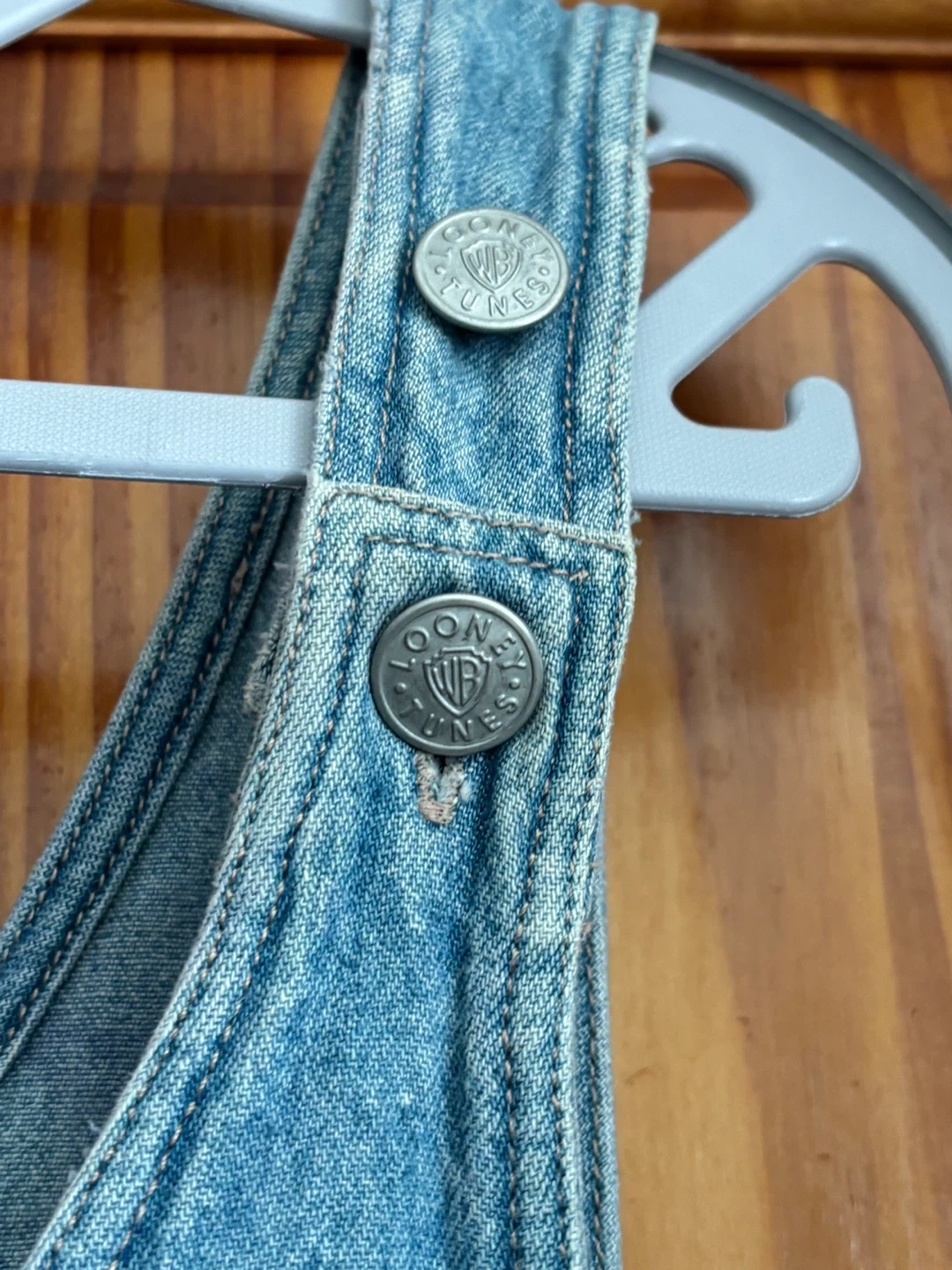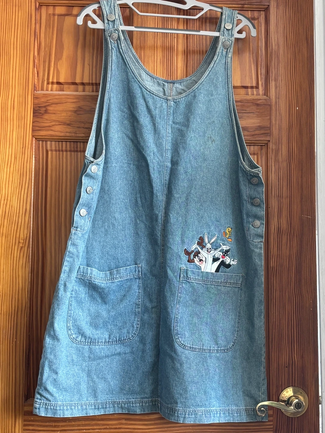 Vintage denim jumper/overall dress with embroidered Looney Tunes characters (Bugs Bunny, Daffy Duck, Sylvester, and Tweety Bird), 100% cotton denim, size Large in excellent like new condition.
