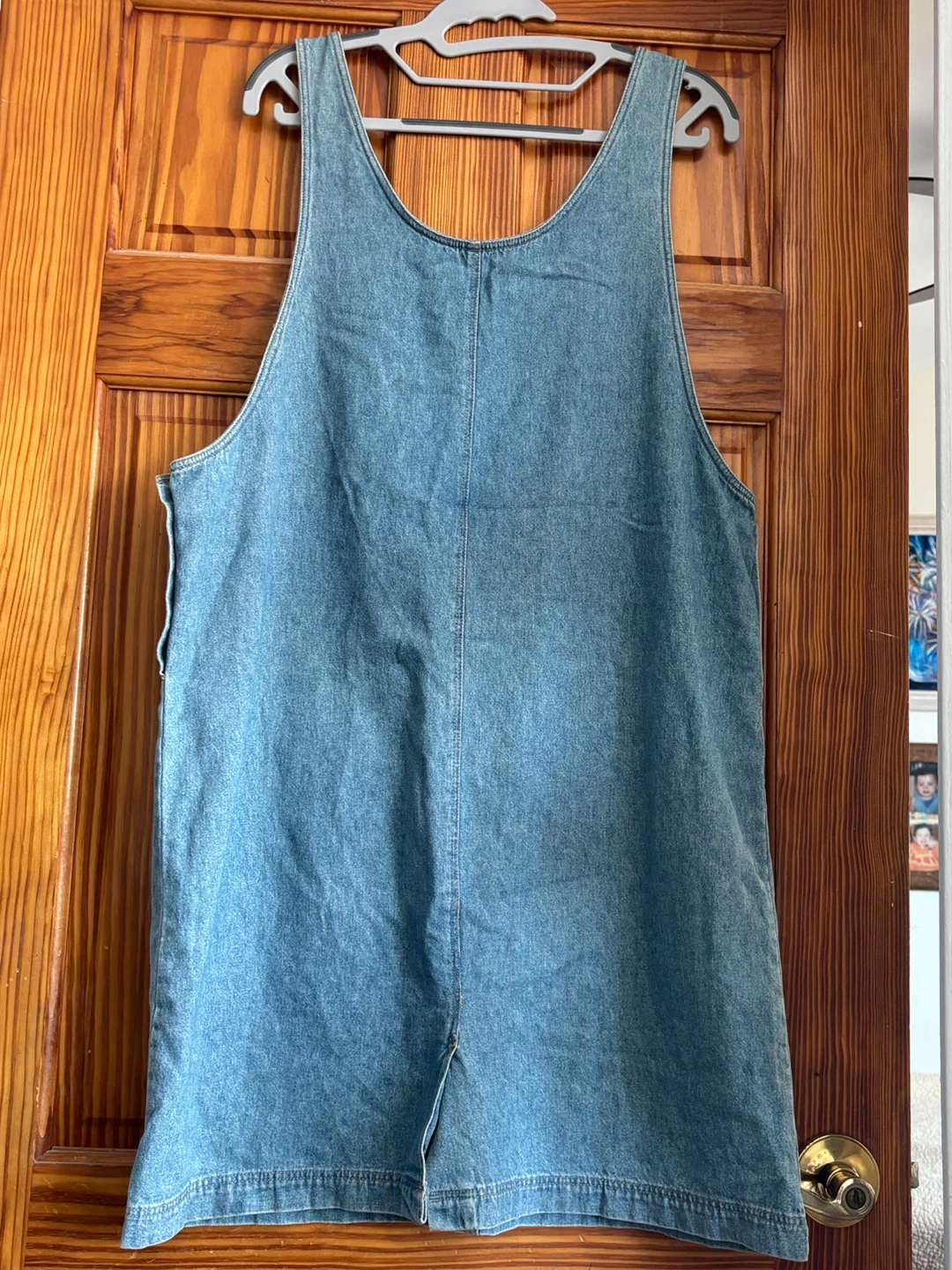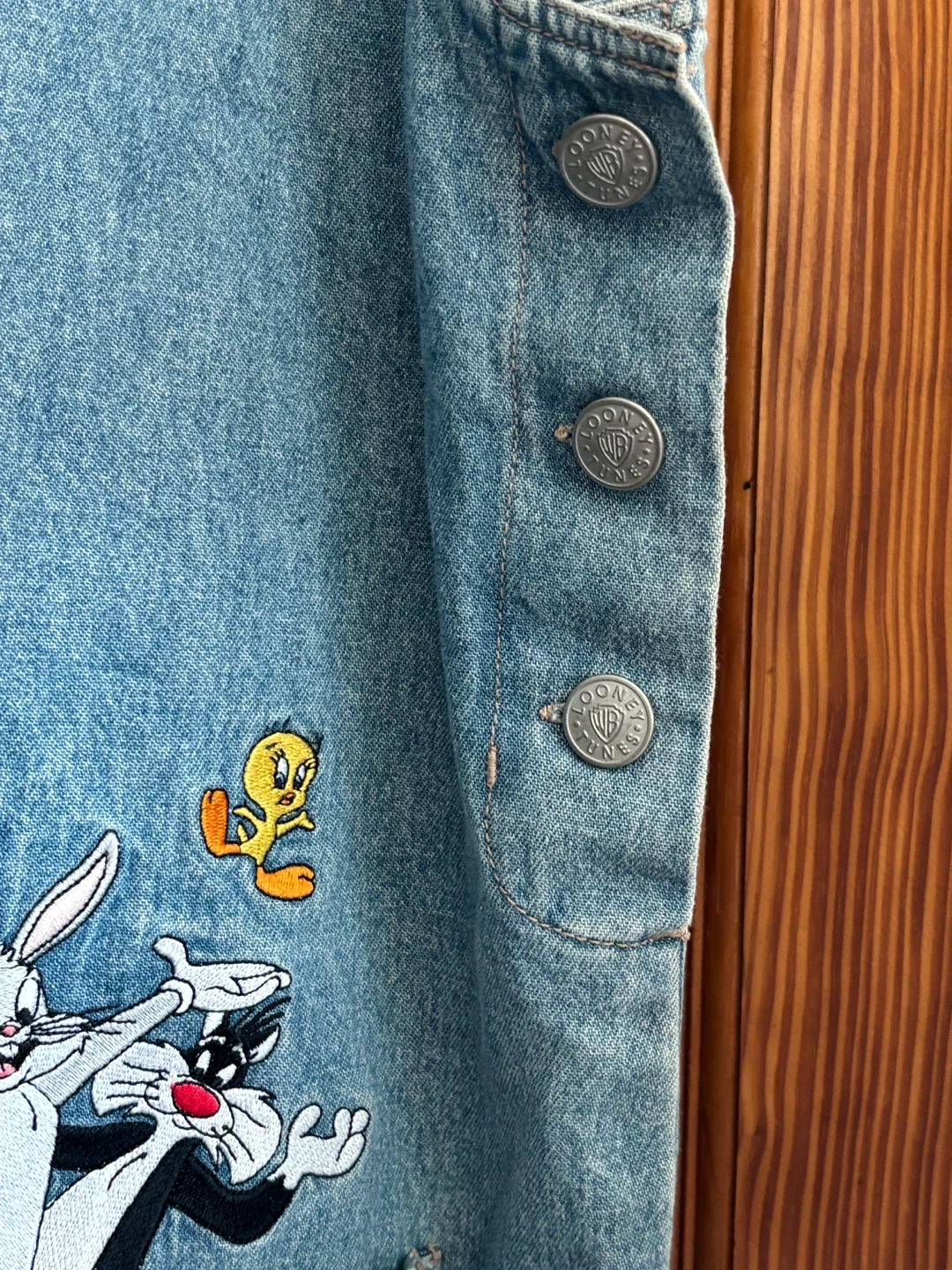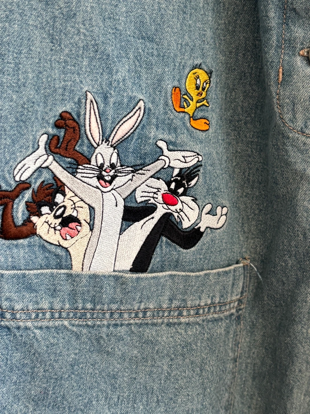 Vintage denim jumper/overall dress with embroidered Looney Tunes characters (Bugs Bunny, Daffy Duck, Sylvester, and Tweety Bird), 100% cotton denim, size Large in excellent like new condition.