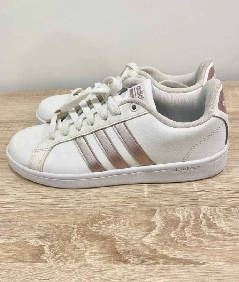 Stylish Adidas Cloudfoam Advantage sneakers in white with rose gold stripes and accents. Women's US size 8.5. Features Cloudfoam for comfortable wear. Pick up near Yonge and St Clair.