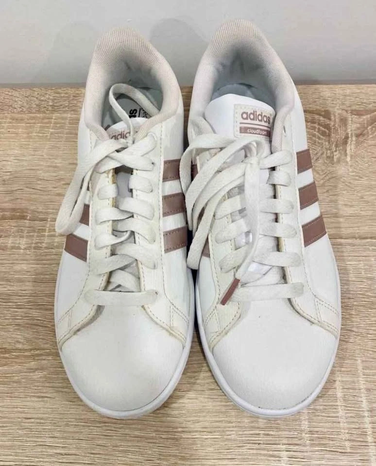 Stylish Adidas Cloudfoam Advantage sneakers in white with rose gold stripes and accents. Women's US size 8.5. Features Cloudfoam for comfortable wear. Pick up near Yonge and St Clair.