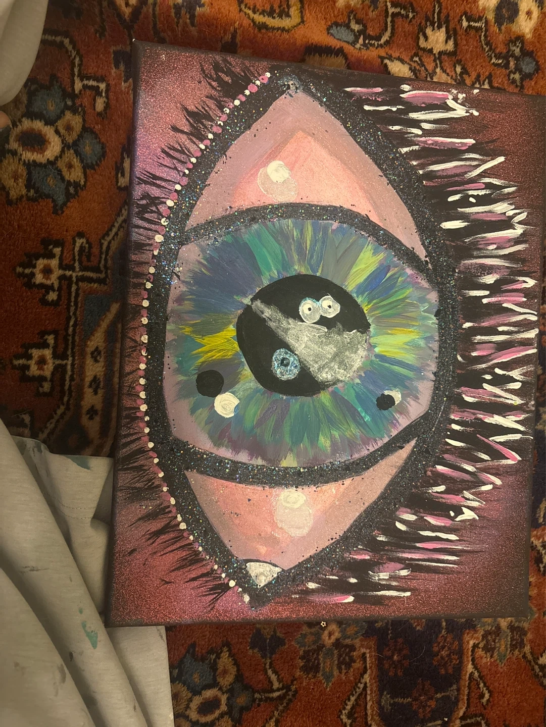 Hand-painted canvas featuring a vibrant eye design. Acrylic paint on canvas with glitter accents. This piece would add a unique touch to any room!