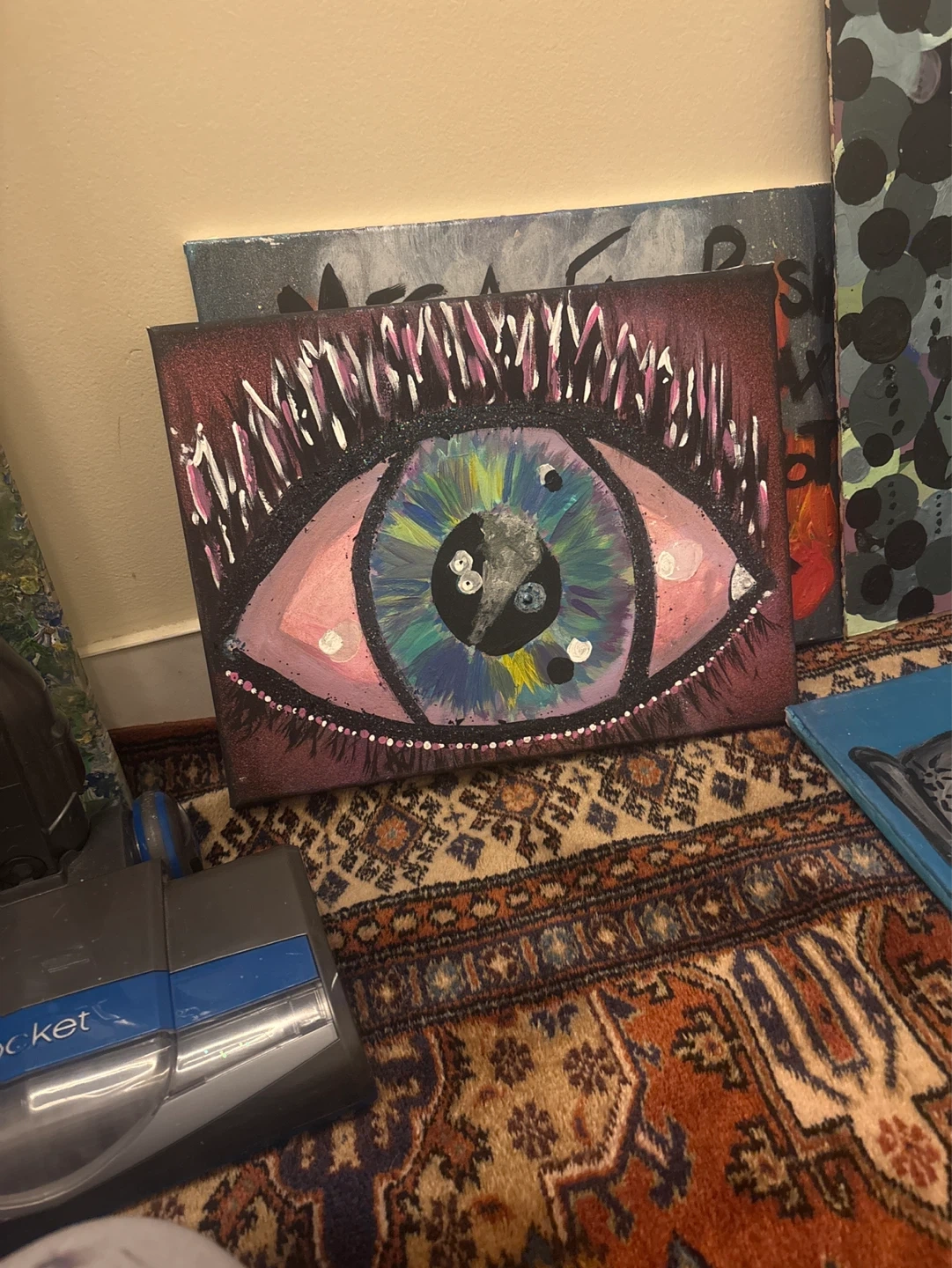 Hand-painted canvas featuring a vibrant eye design. Acrylic paint on canvas with glitter accents. This piece would add a unique touch to any room!