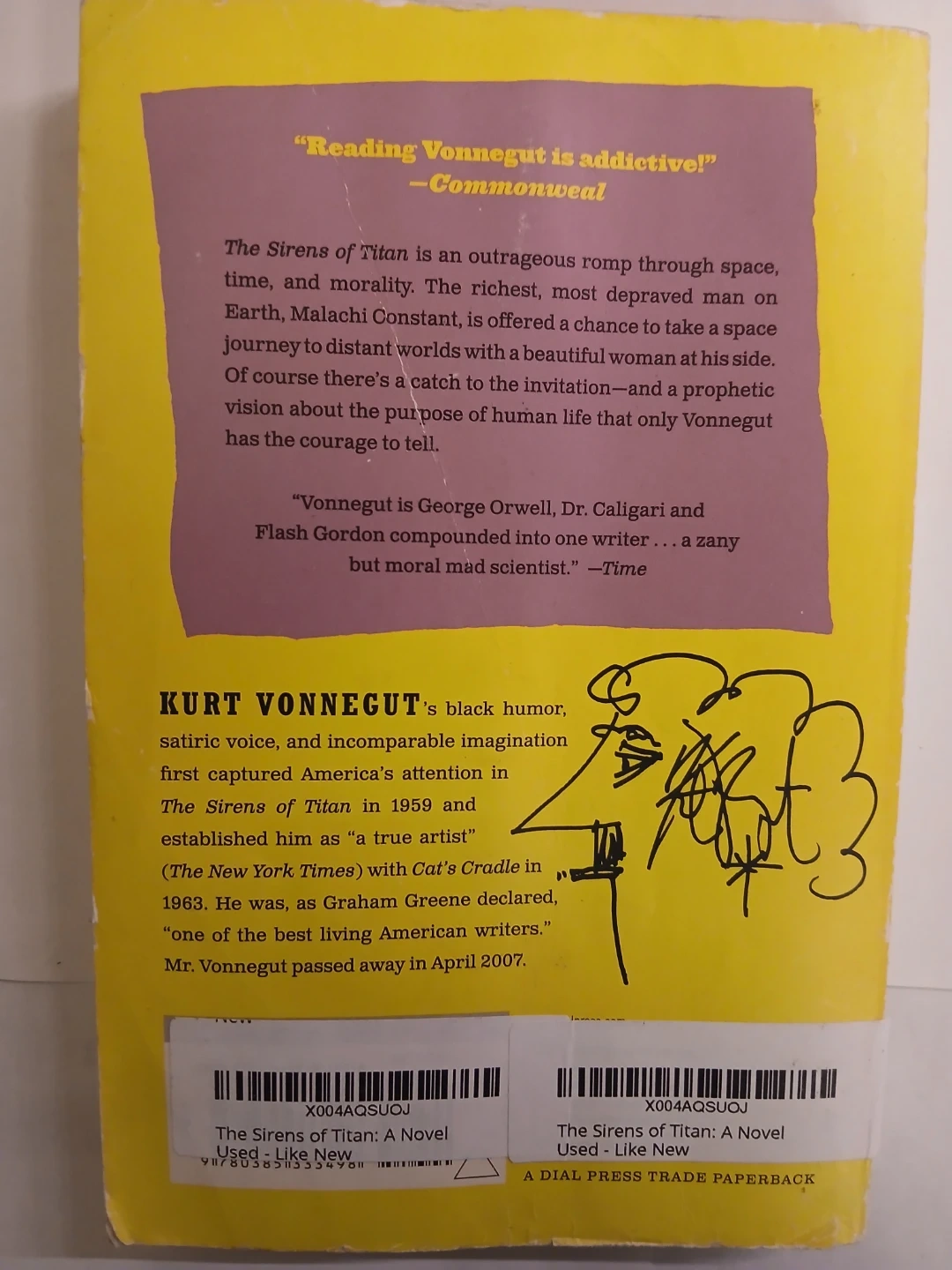 This is Kurt Vonnegut's novel, The Sirens of Titan. It's a tale of space, time, and morality. Published originally in 1959, it explores big questions with Vonnegut's signature dark humor and satire.