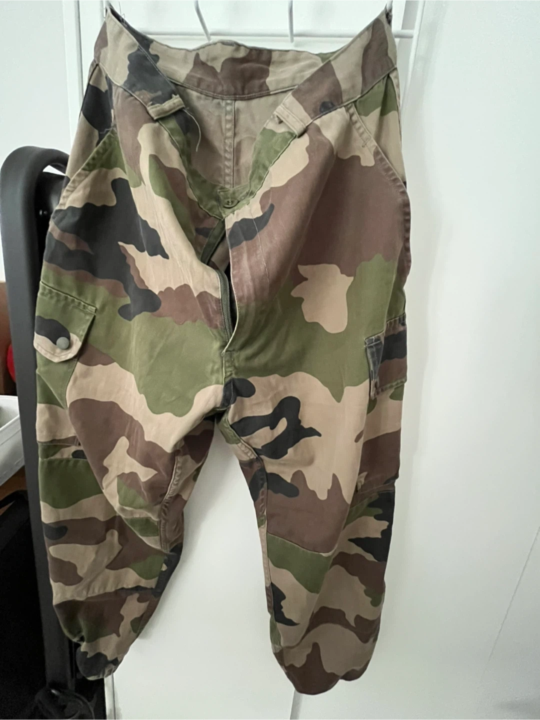 These are camouflage cargo pants with an elasticated cuff. They feature multiple pockets and a button closure. Great for outdoor activities or a rugged look! Also they’re thifted. :)
