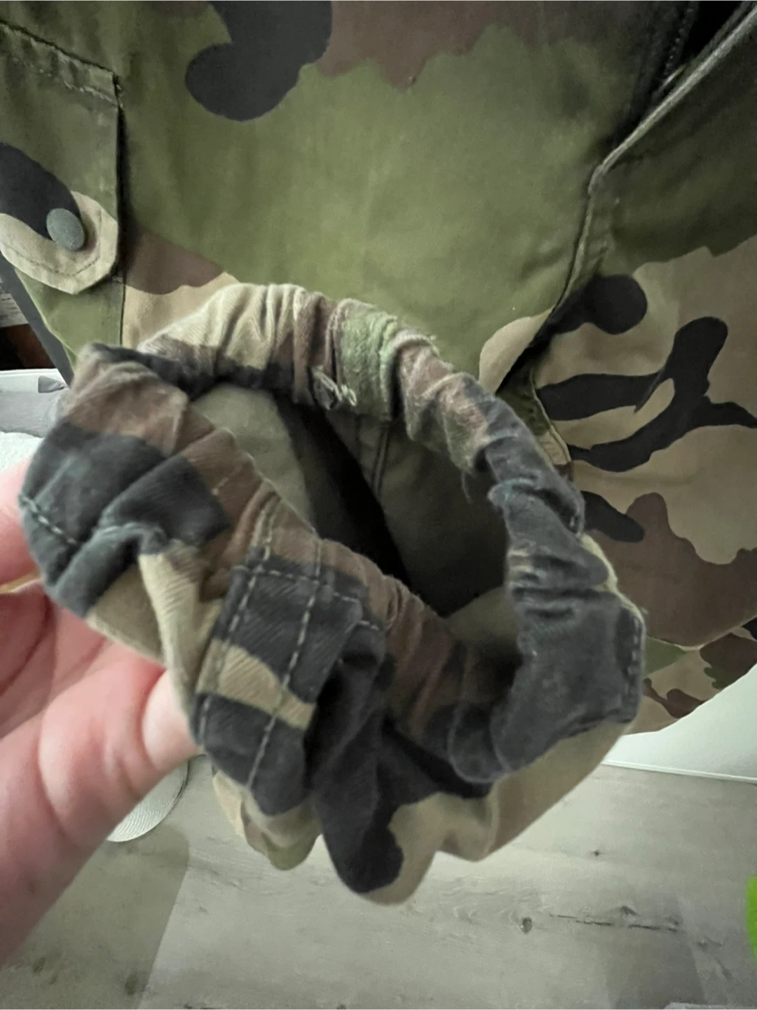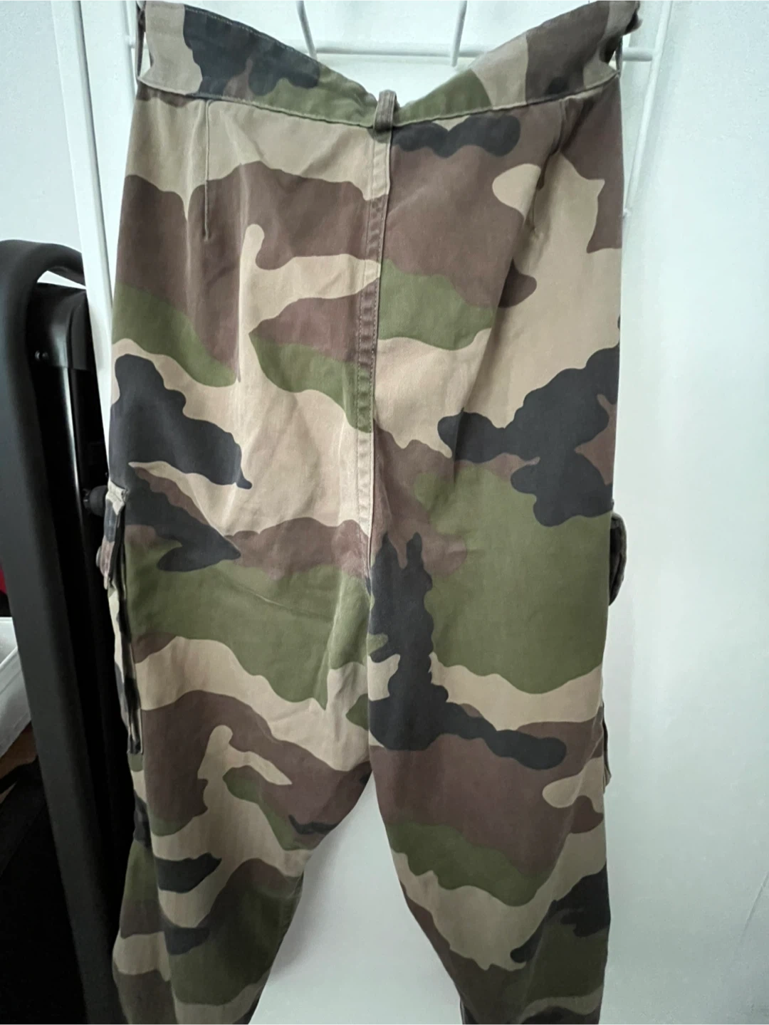 These are camouflage cargo pants with an elasticated cuff. They feature multiple pockets and a button closure. Great for outdoor activities or a rugged look! Also they’re thifted. :)