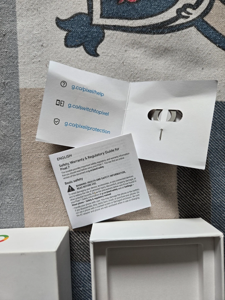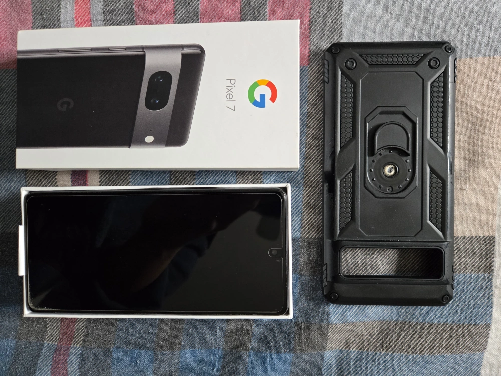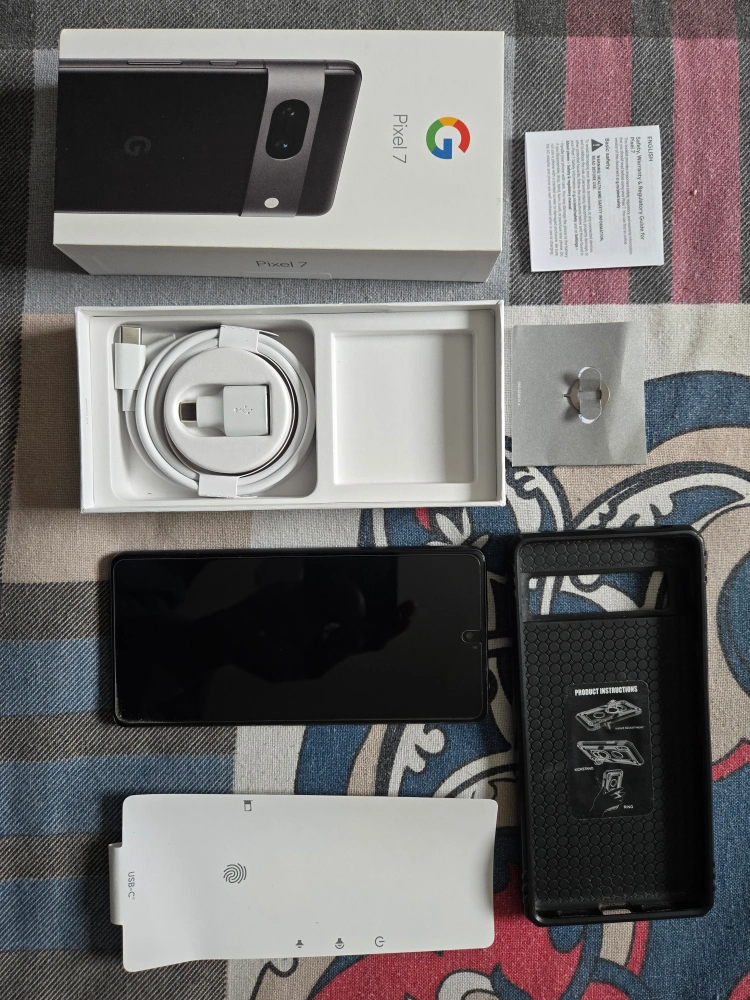 Sealed Google Pixel 7 smartphone. Includes original box, charging cable, SIM ejector tool, and protective case. Never activated. Unlocked and ready for any carrier.