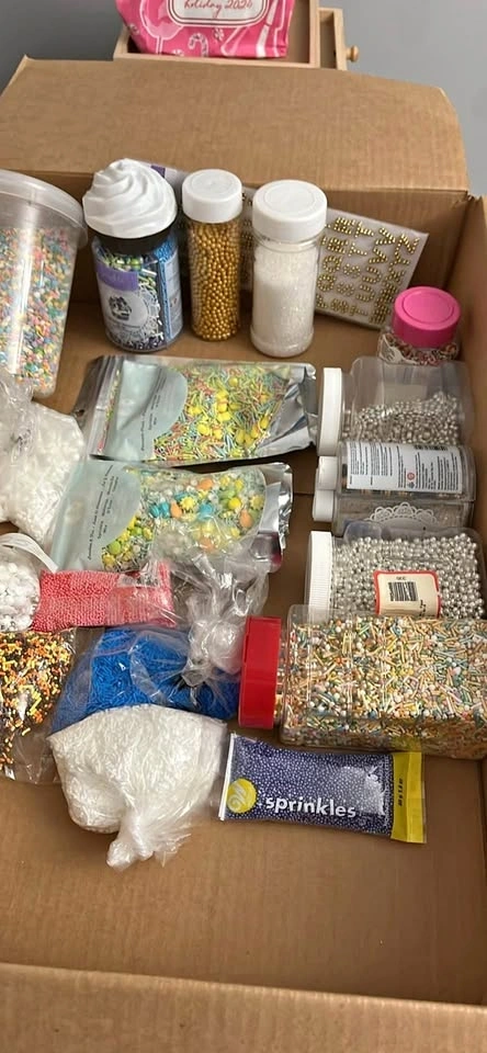 Huge lot of sprinkles and edible decorations. So many different kinds here! Colorful sprinkles, gold and silver pearl sprinkles, white sugar, blue, red, and even some cute flower shapes. Many are in big containers, some in bags. Great for baking and decorating cakes, cupcakes, cookies.