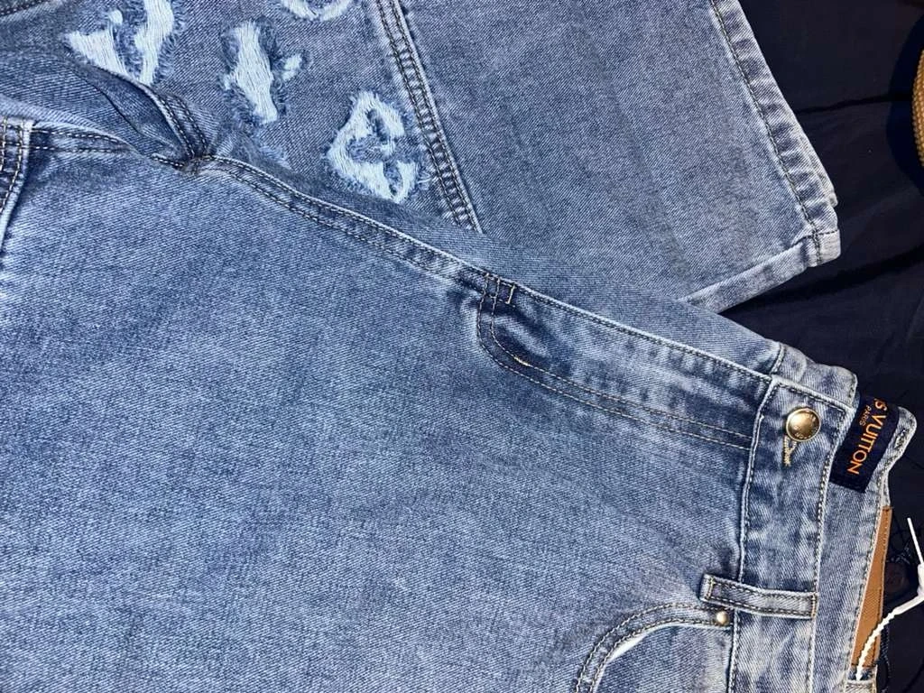 Light blue wash denim jeans. Features distressed detailing and the Louis Vuitton Paris logo patch. These jeans are made of cotton.