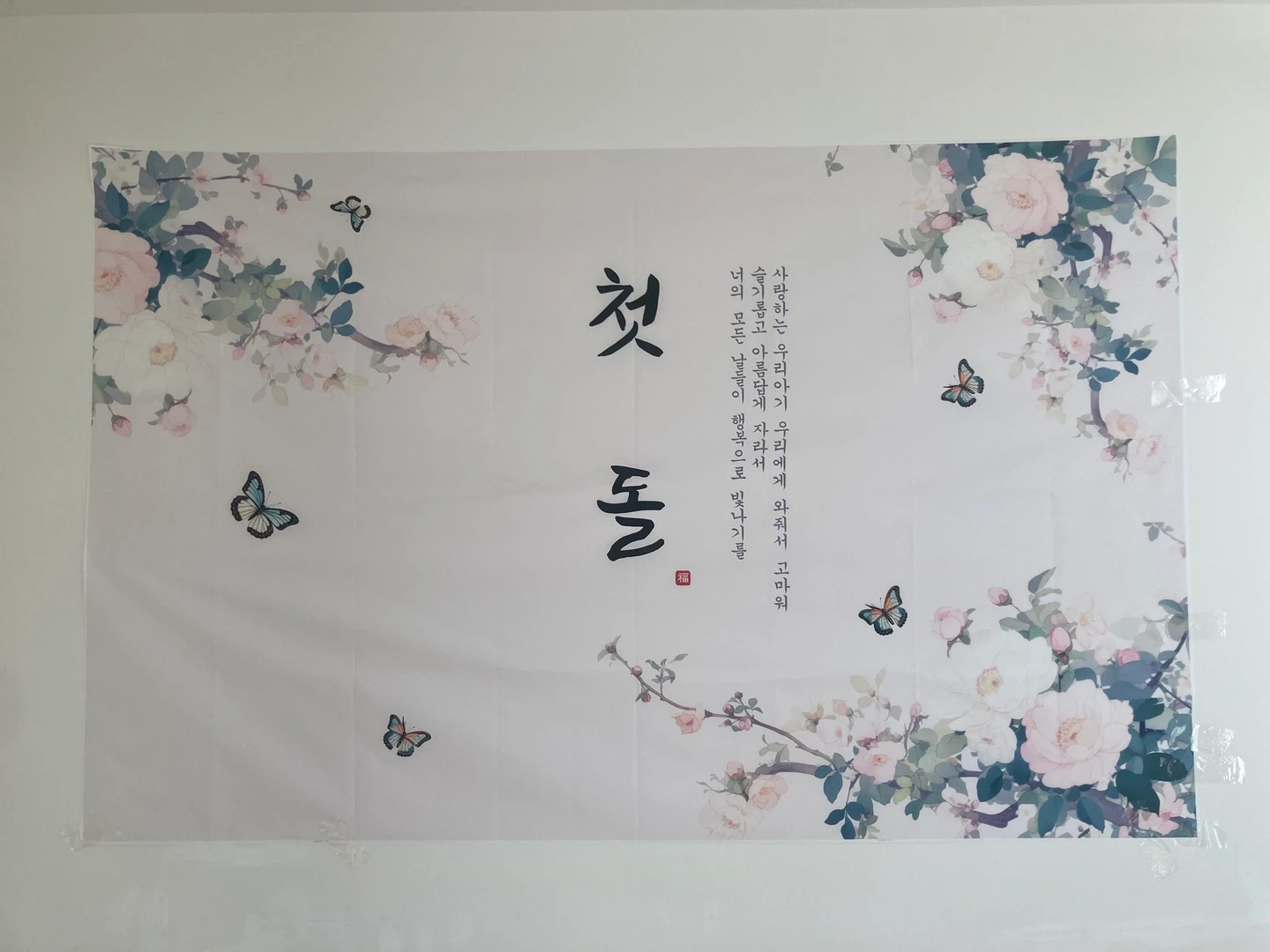 A beautiful banner for a baby's first birthday celebration, known as 'Dol' in Korean. It features floral and butterfly designs with text expressing gratitude and wishes for a happy future. This banner is perfect for creating a festive atmosphere for the special Doljabi ceremony.