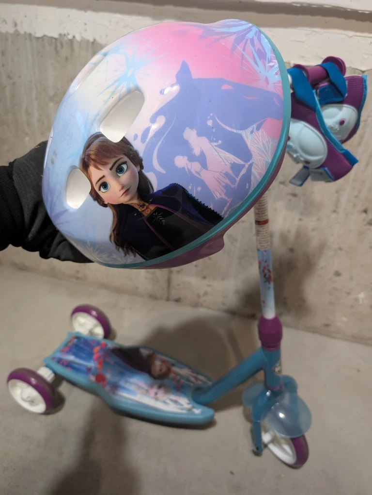 This is a Disney Frozen themed scooter and helmet set. The scooter has three wheels and the helmet features characters from the movie. It's perfect for young riders learning to balance. The set includes knee pads for added safety.