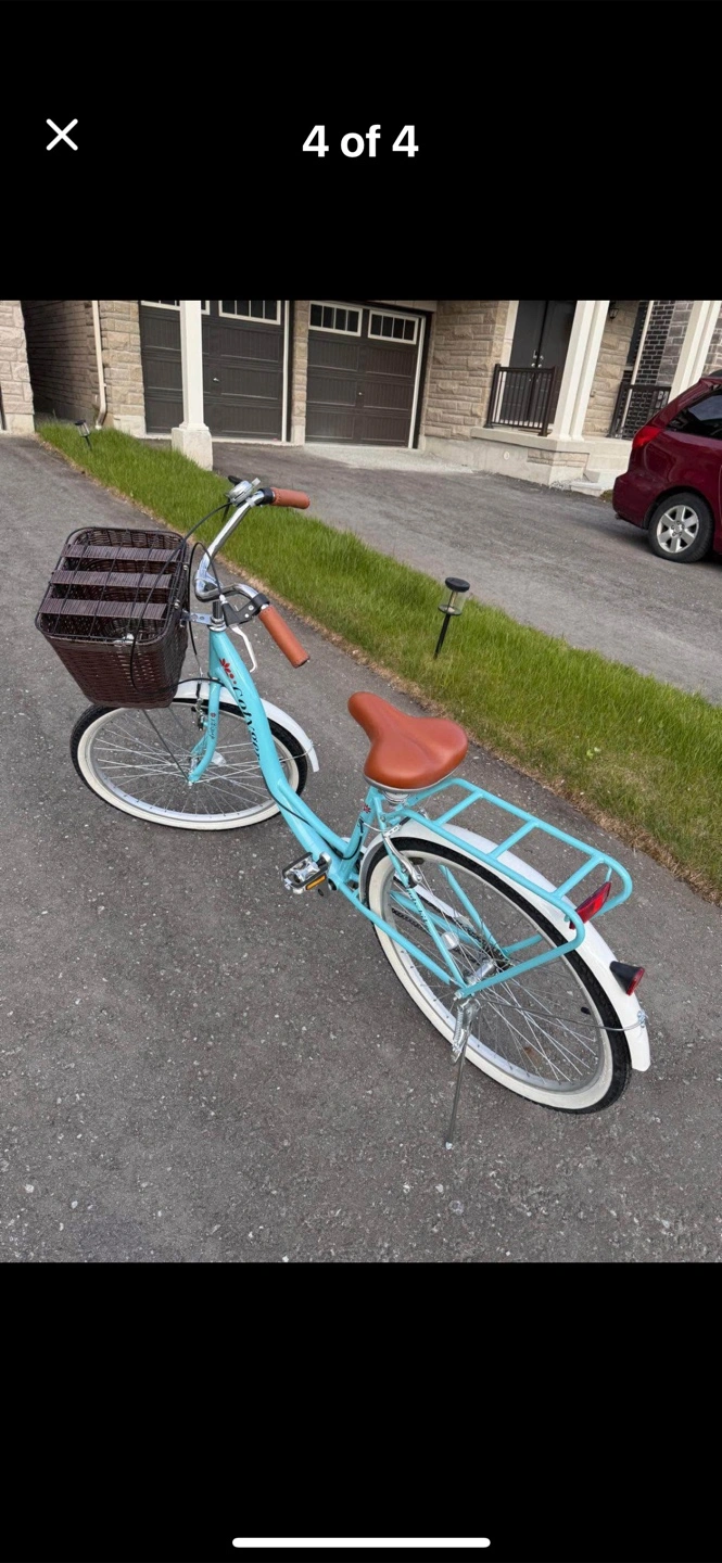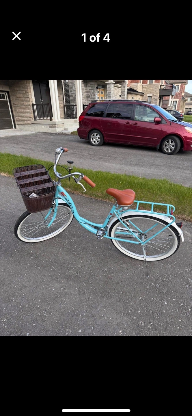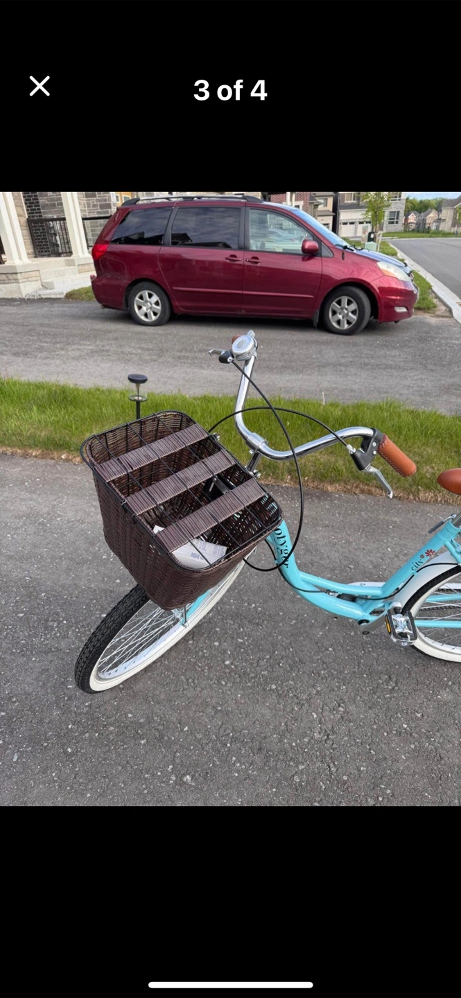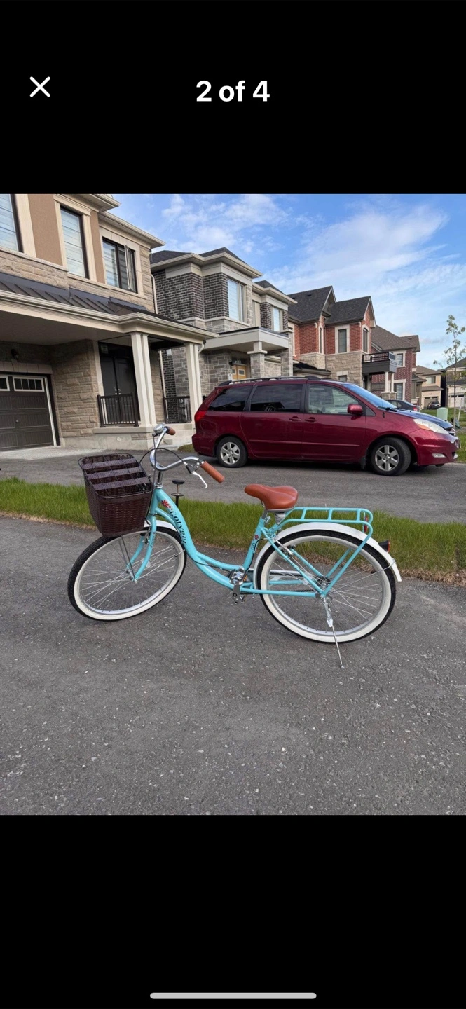 A beautiful beach cruiser bike. Light blue in colour. Has a basket, comfortable brown seat, and white tires. Great for a leisurely ride on a beautiful day.