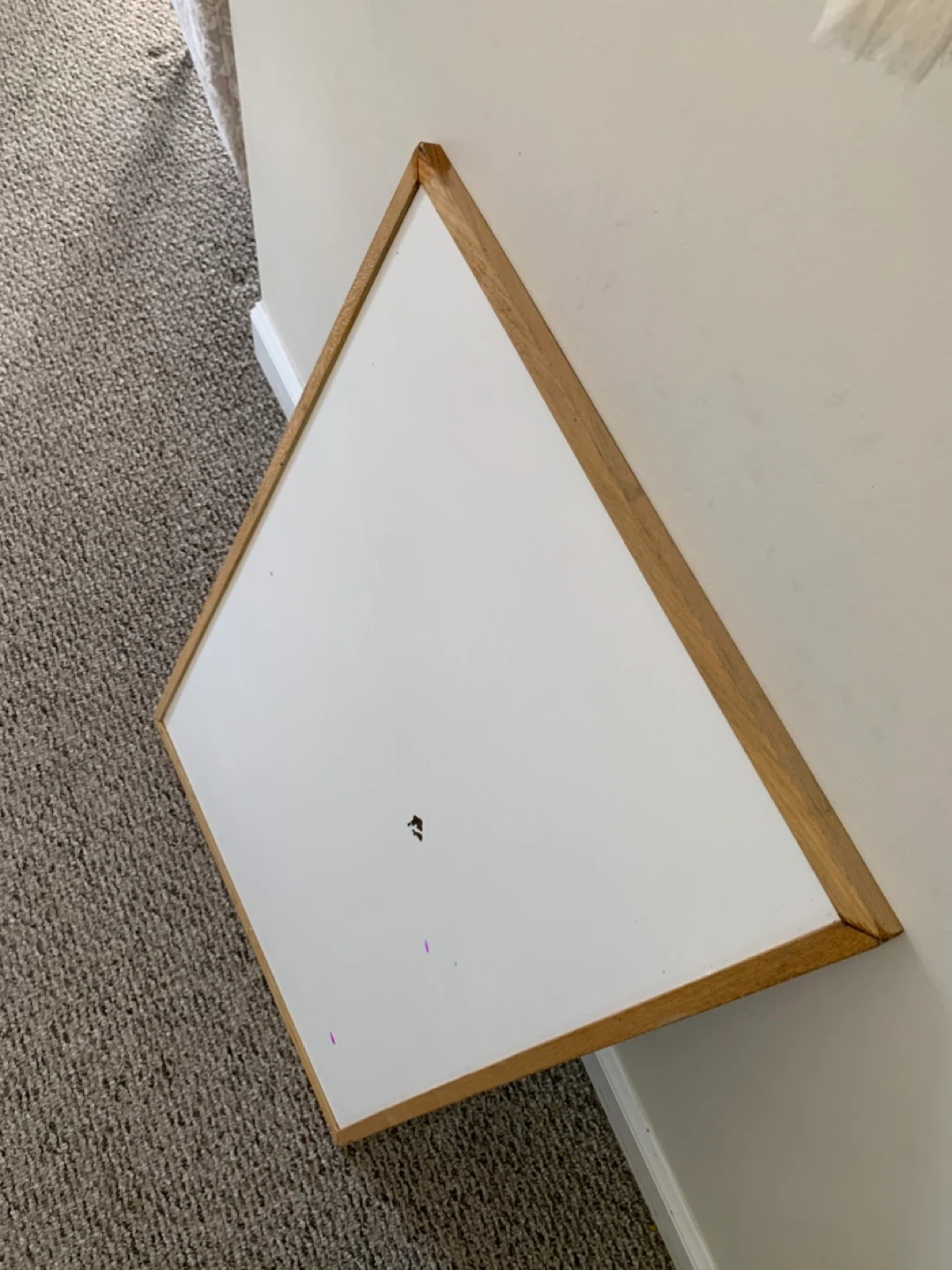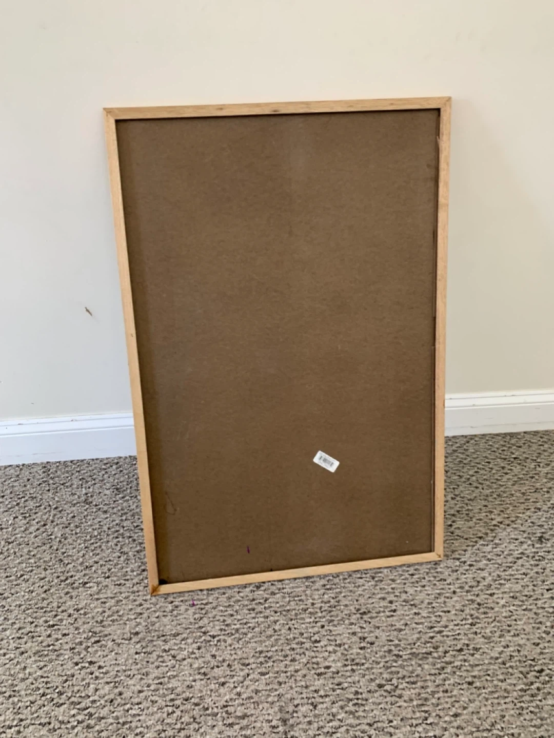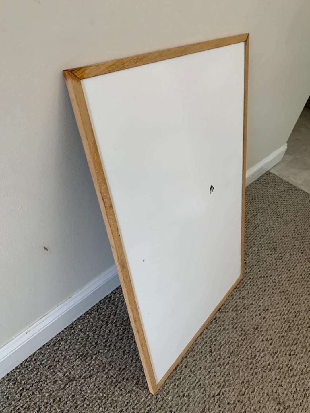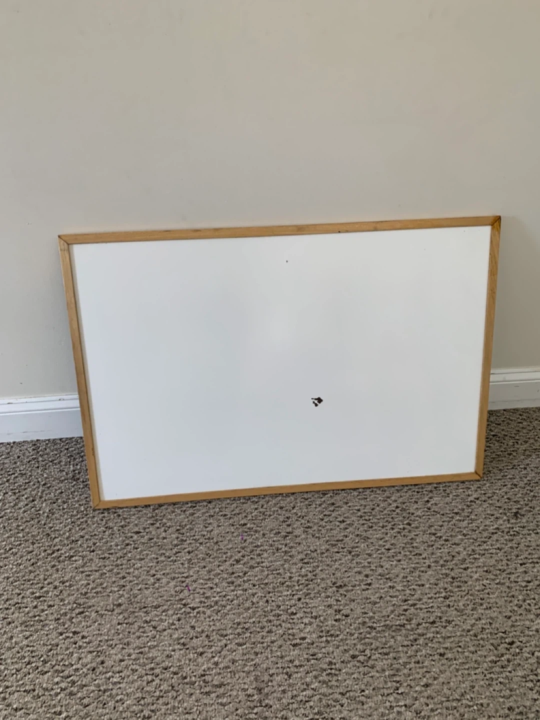 A whiteboard with a natural wood frame. It has a smooth writing surface, though there are some minor marks present (see photos)