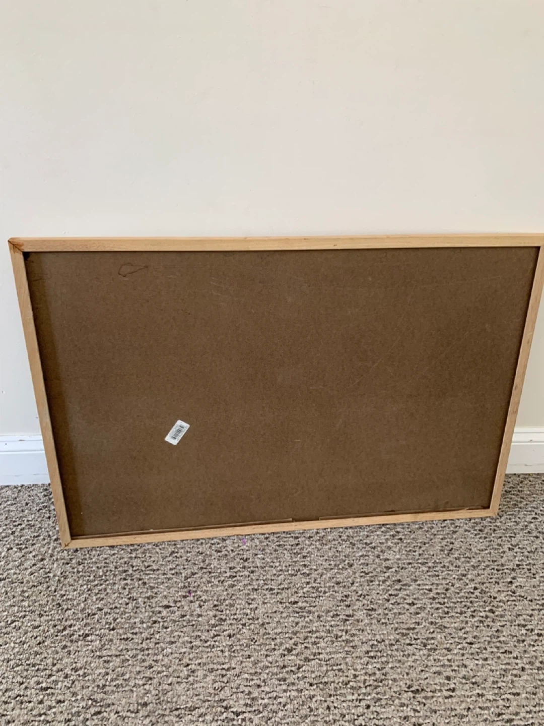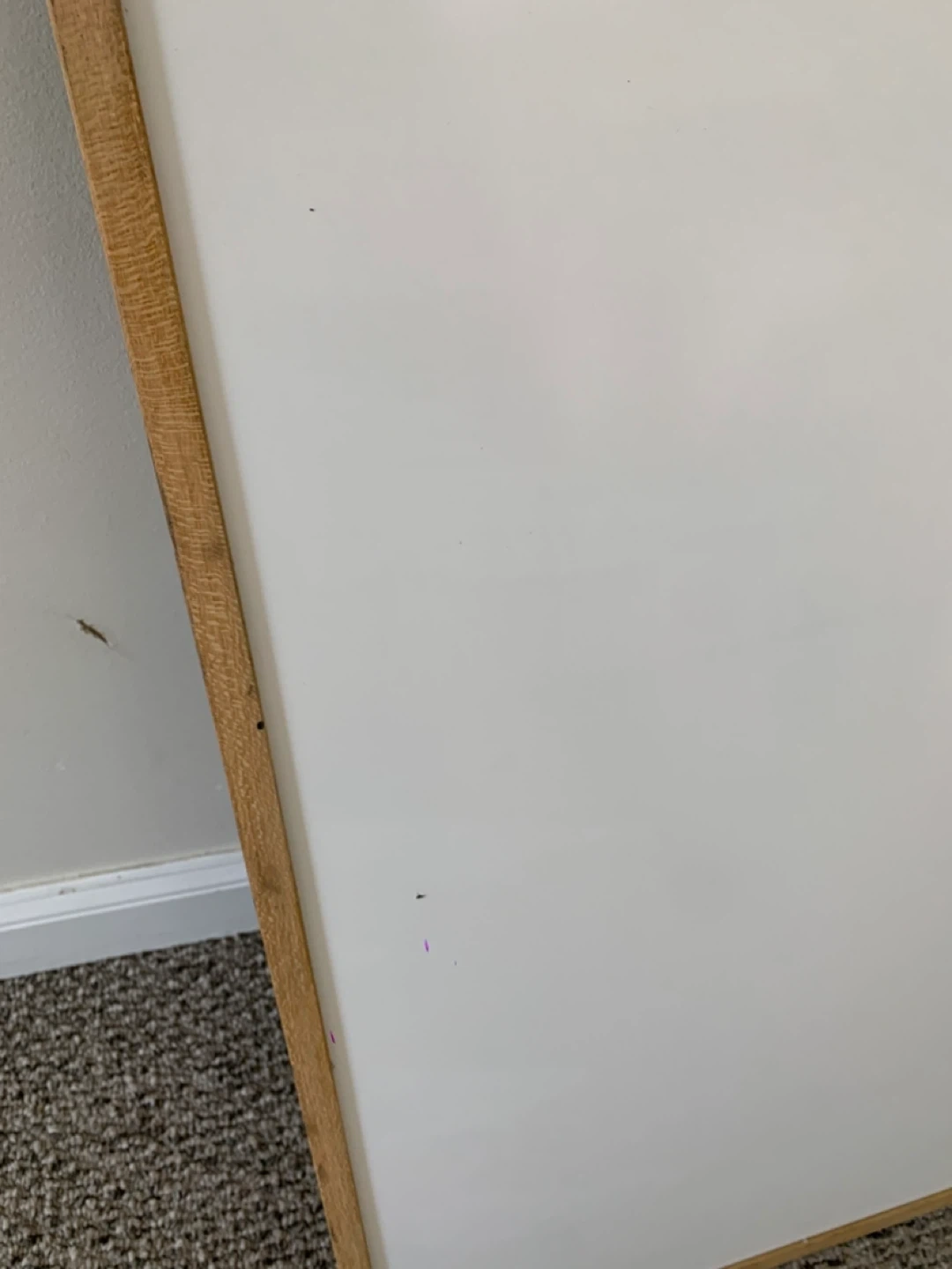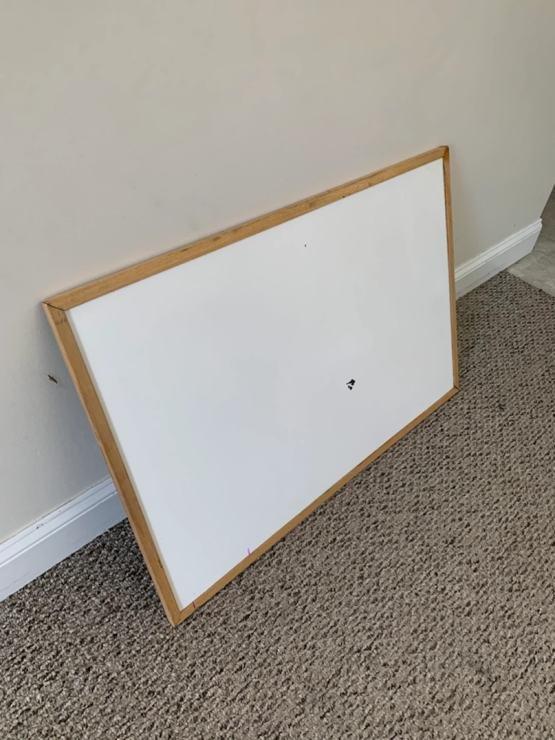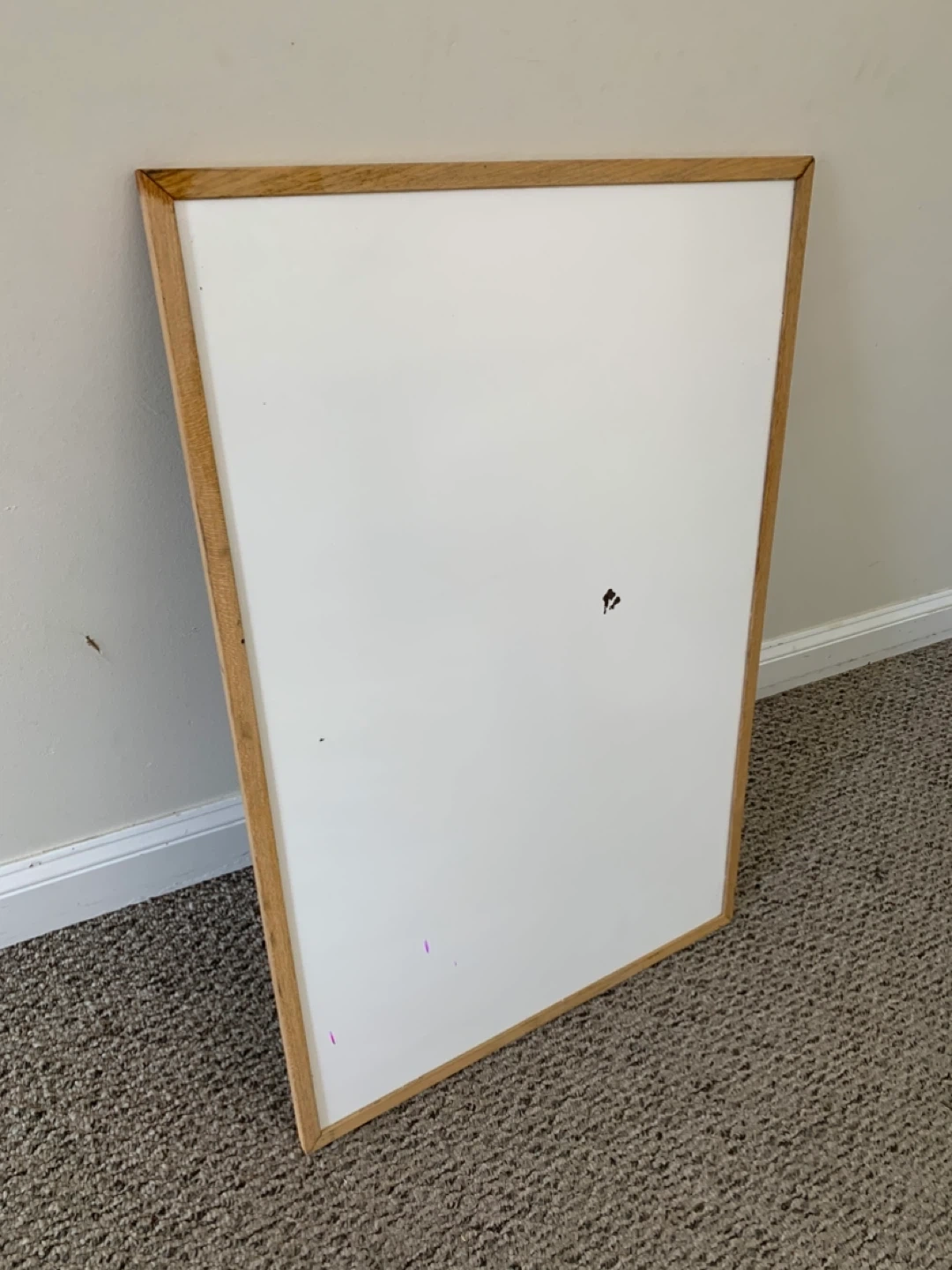 A whiteboard with a natural wood frame. It has a smooth writing surface, though there are some minor marks present (see photos)