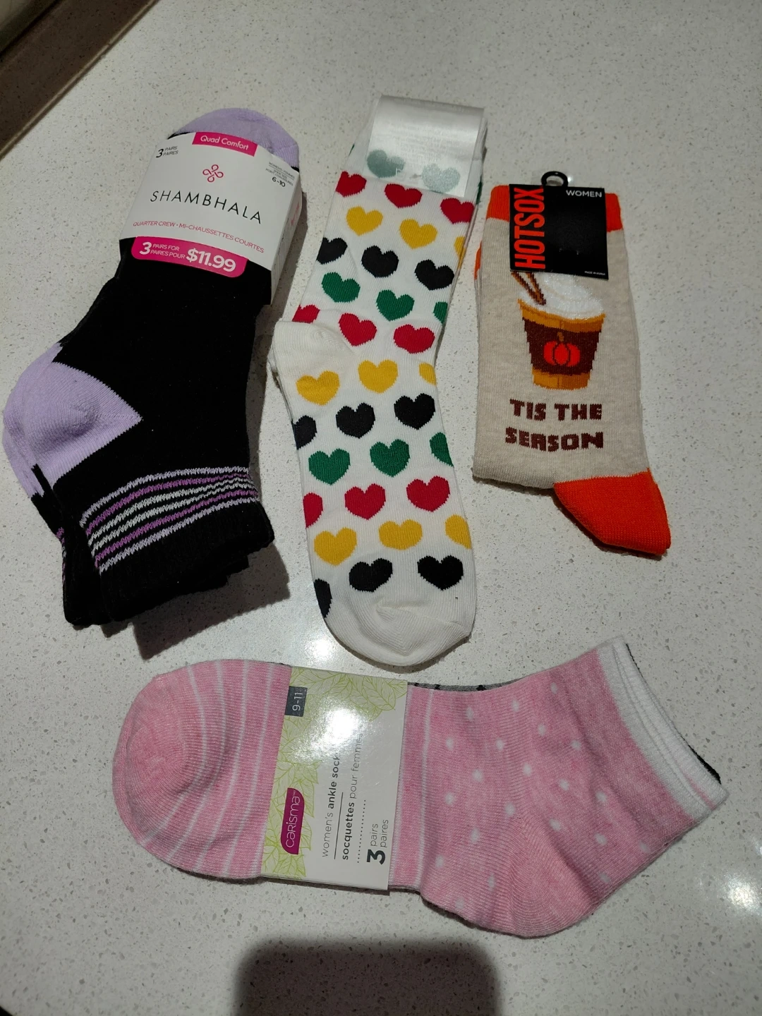 3 pairs of Shambhala quarter crew socks, 1 pair with colourful hearts, 1 pair with 'Tis The Season' by Hotsox and 3 pair of Carisma ankle socks.