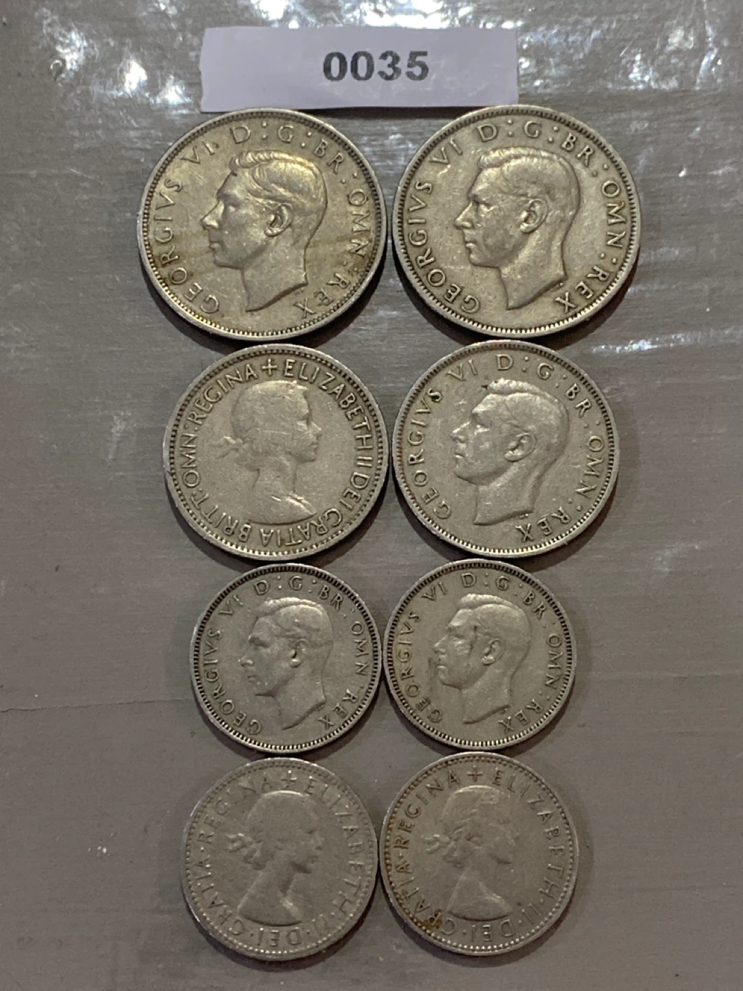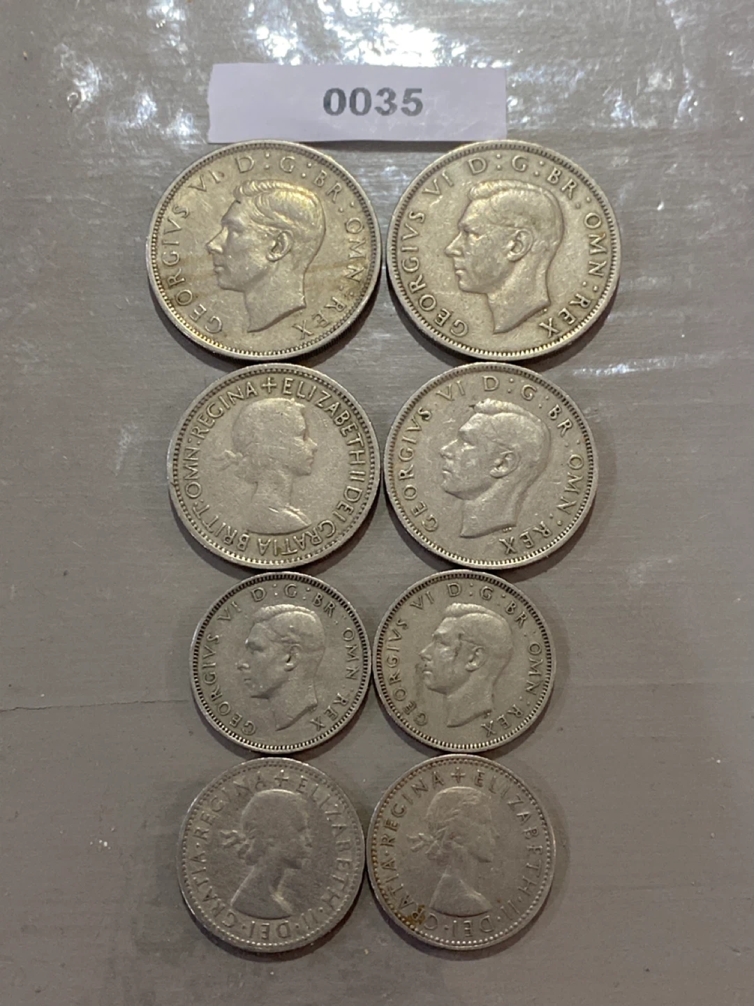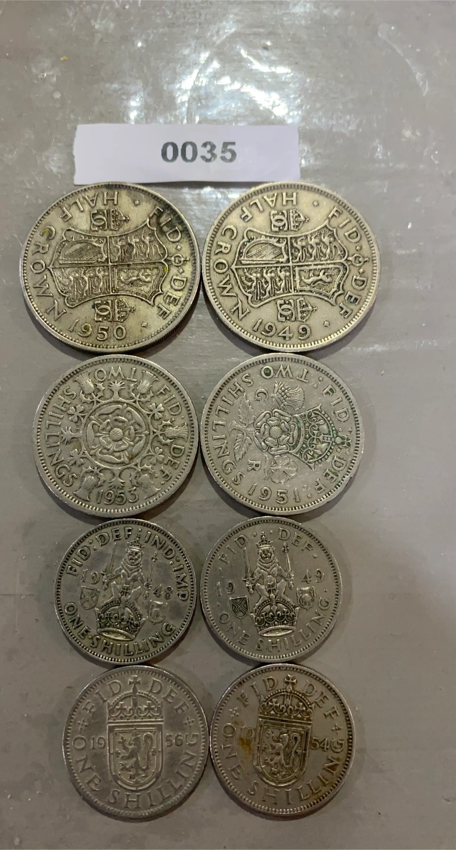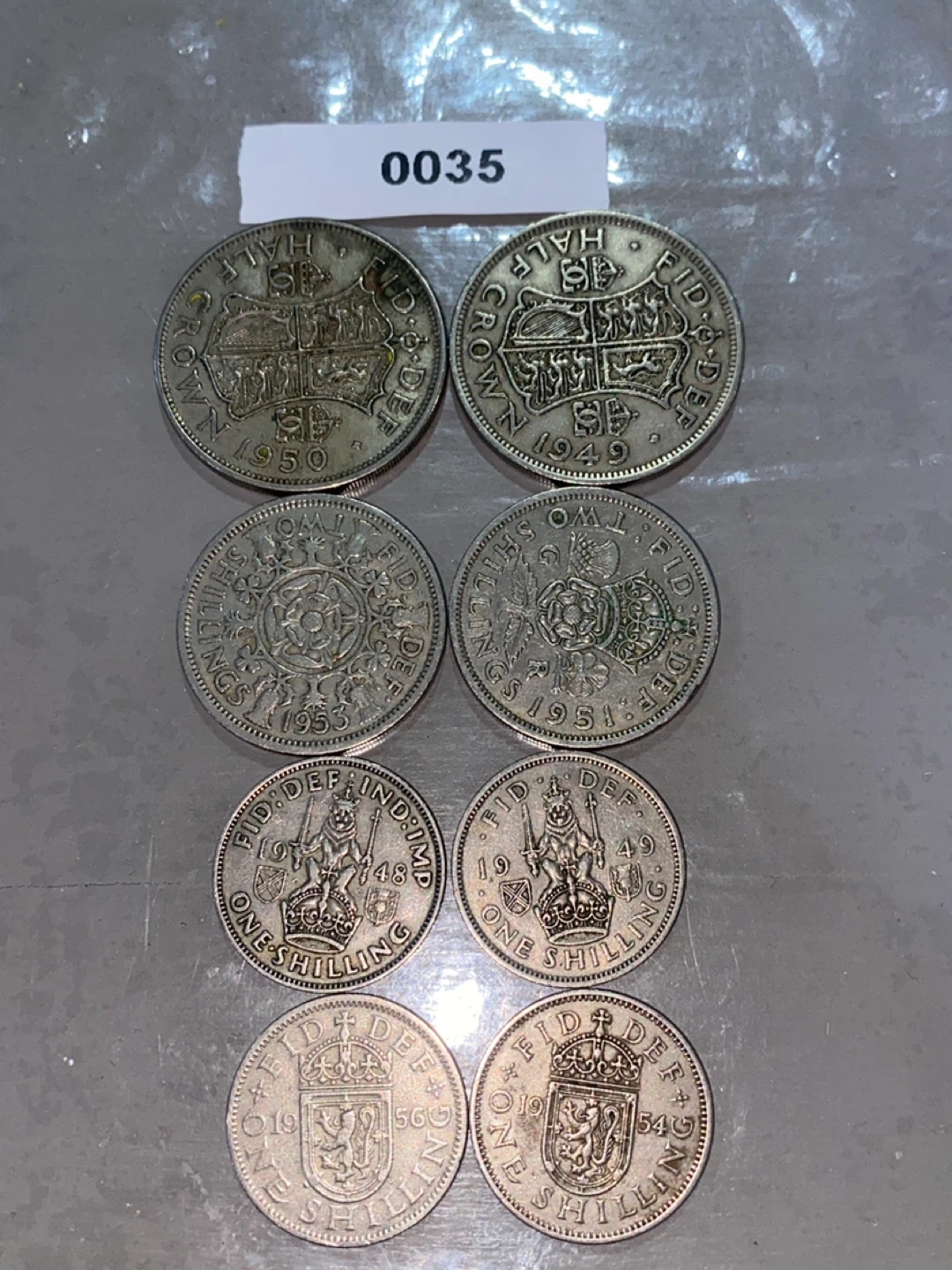 A collection of various British coins. Includes half crowns, two shillings, and one shilling denominations. Dates range from 1948 to 1954. These coins are great for collectors or for educational purposes.