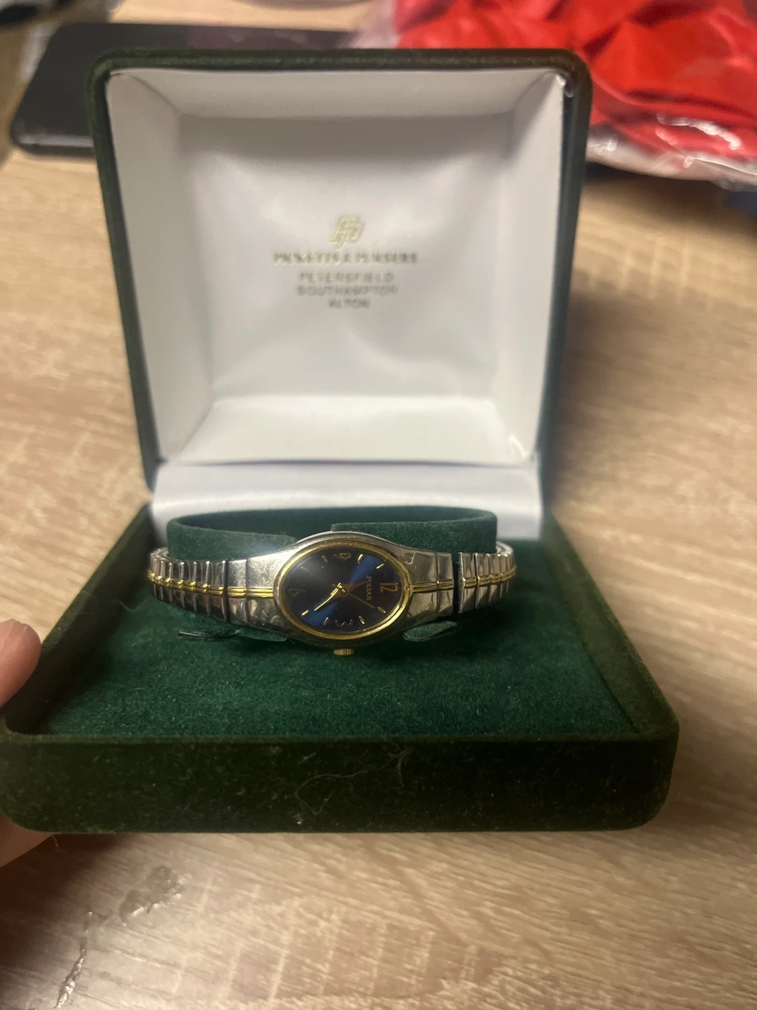 This is a Pulsar women's watch with a blue face and a silver and gold-toned band. It includes its original presentation box. The watch comes with the Pulsar brand name and appears to be in good condition.