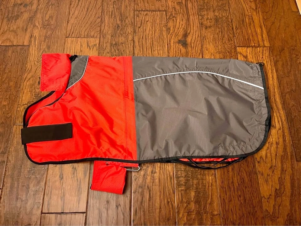 New, never worn. Our puppy grew out of it before we could use it. We purchased a larger size after for our shepherd and it’s a great coat. Easy to use and stays on well.